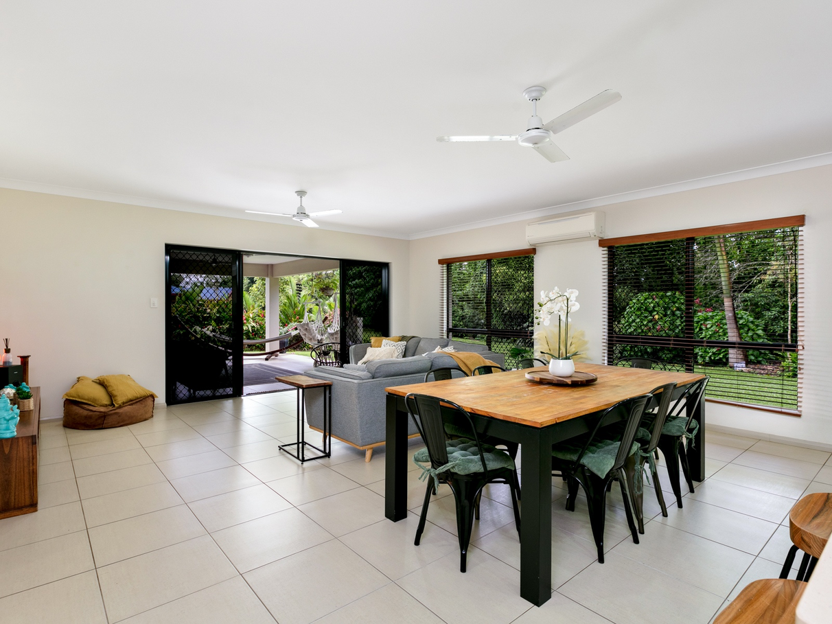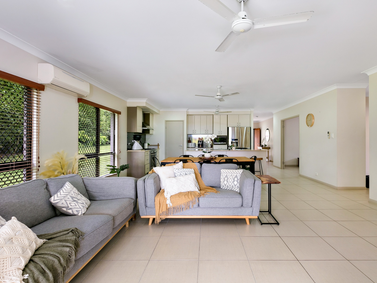 Open plan living with 2 large living areas that open up onto the spacious outdoor patio .