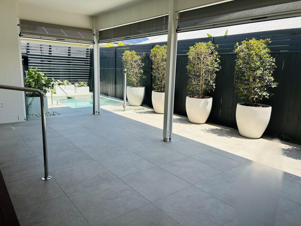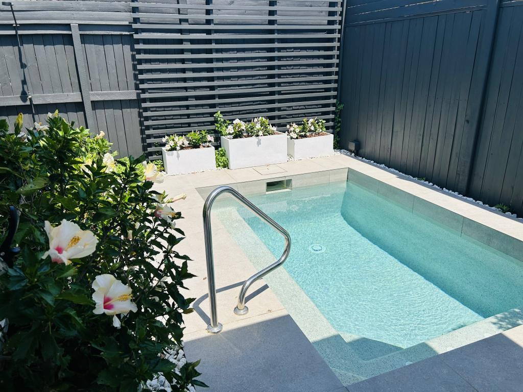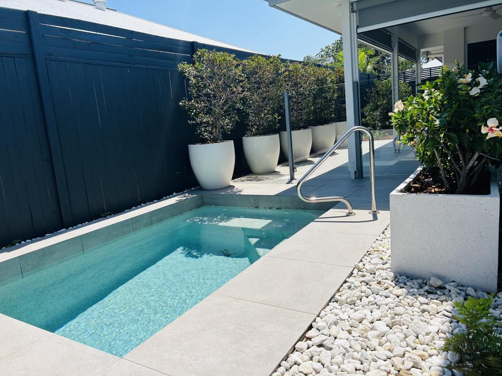 The outdoor entertainment area boasts a casual lounge or BBQ area, features pull down blinds for sun screening and a north facing inground plunge pool with spa seat.