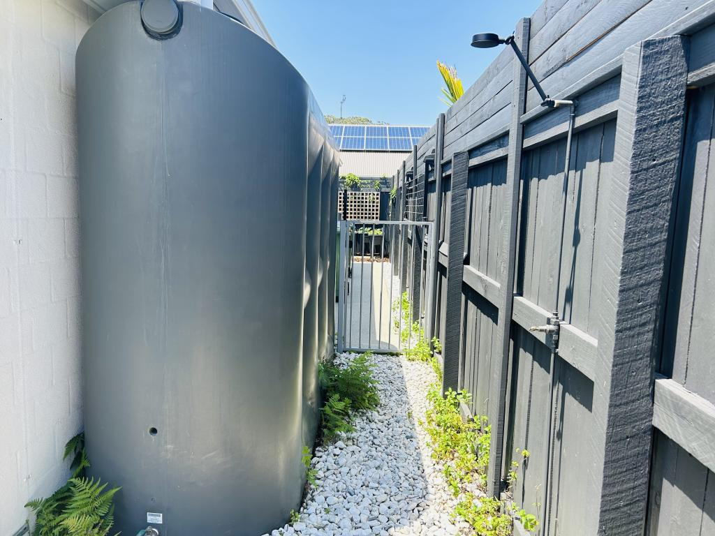 The 3000 litre water tank is connected to the external hoses for watering gardens, washing cars and topping up the pool.