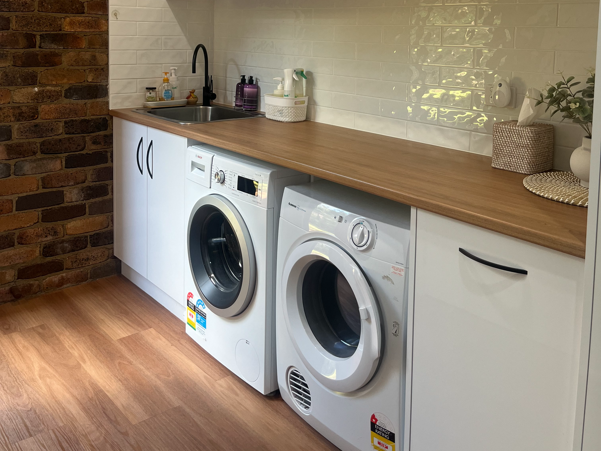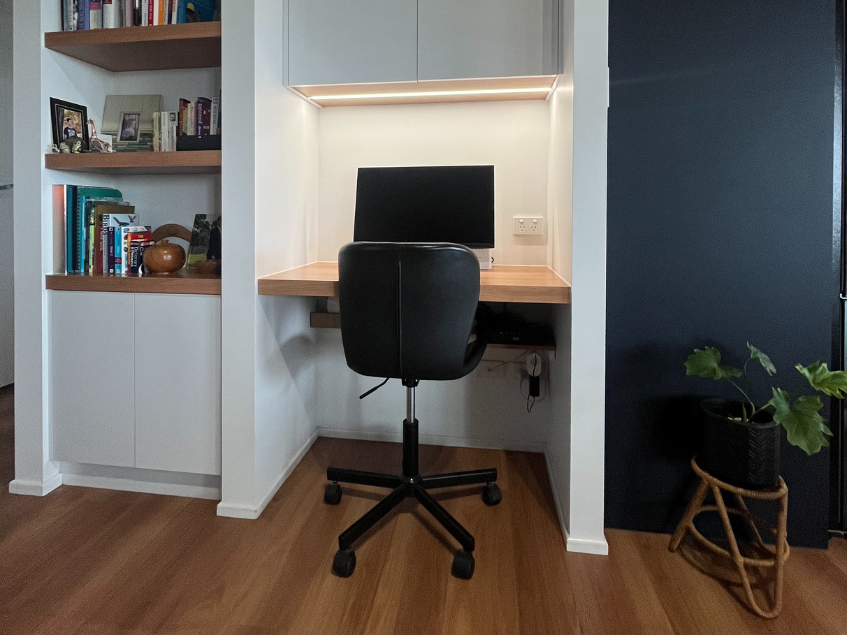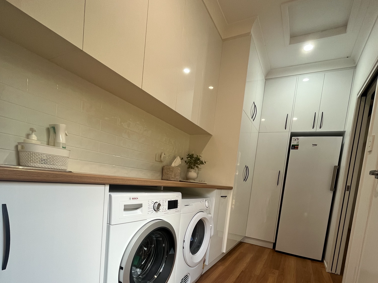 The laundry offers floor-to-ceiling cupboard space providing ample storage, and a built-in washing hamper for convenience. The living area includes a Study nook with built in book shelves and cupboards.