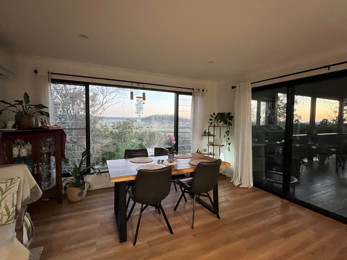 The airy, light-filled meals room includes a large glass viewing window that frames the stunning views. Striking brick feature walls at each end of the home add character and warmth to the living spaces.