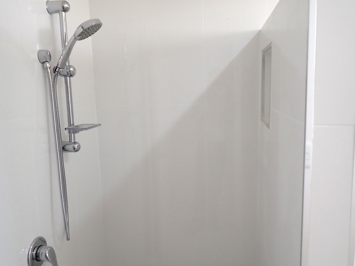 New bathroom - shower, vanity, shaving cabinet, taps & tiling