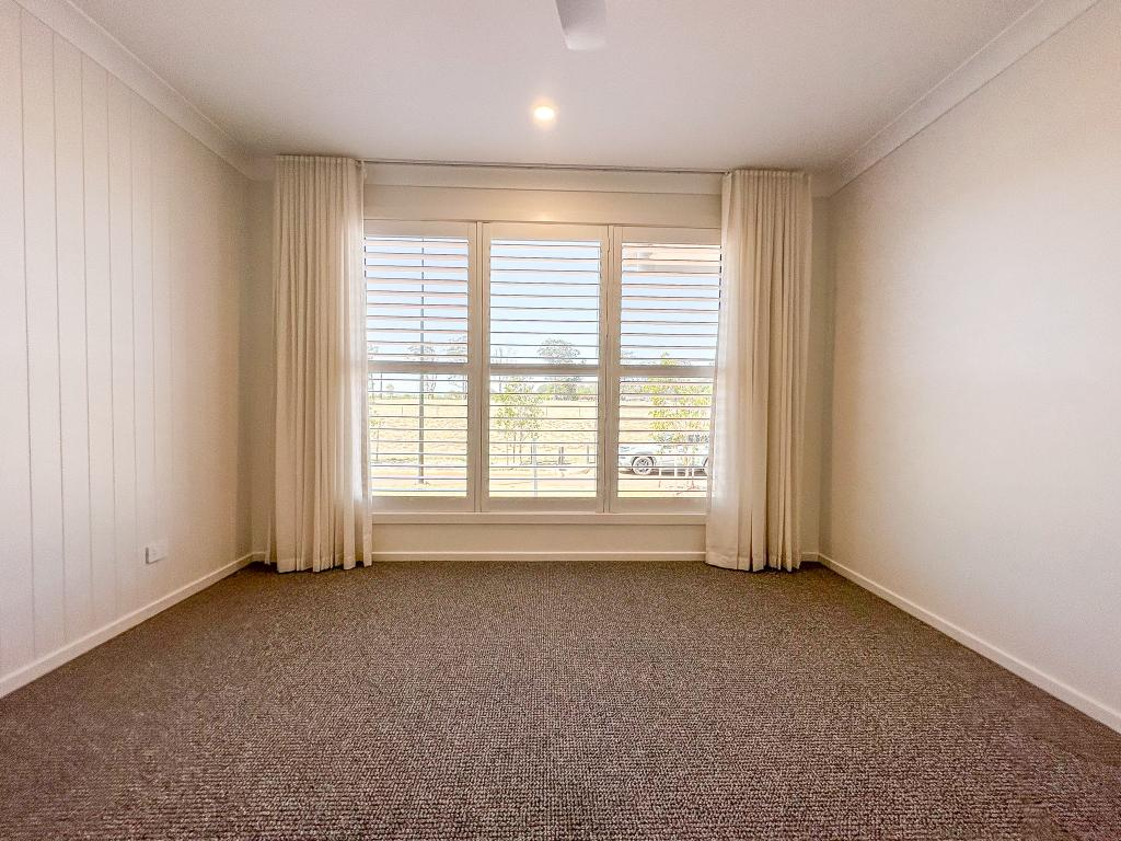 Master bedroom has plantation shutters with linen curtains for a luxurious feel.