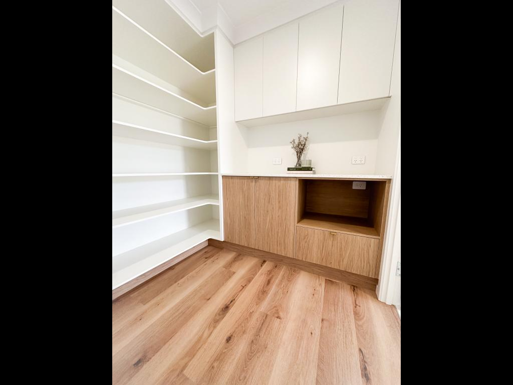 Large kitchen, with huge island workbench with lots of draws. Large walk in pantry with shelves and work space.