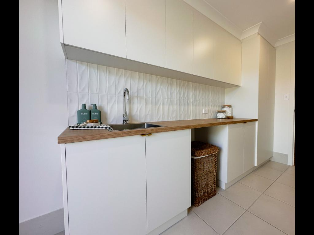 Large Laundry with lots of work bench space. Area for a top load washing machine and floor mounted drier. Under mount sink.