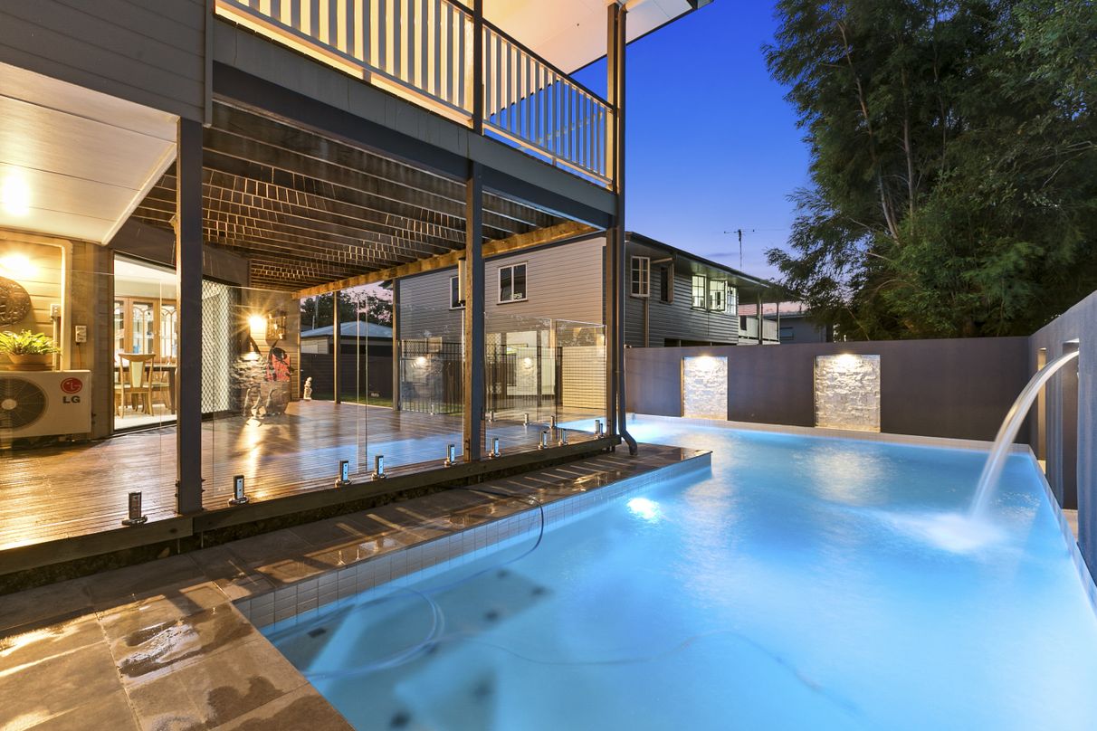 Downstairs is fully self-contained, with 2 bedrooms – 1 double and 1 wired for media – 1 bathroom, full kitchen and open plan living/dining. It features polished porcelain tiles to the living area, and carpeted bedrooms. A huge deck provides a wonderful undercover entertainment space overlooking the resort style swimming pool and city glimpses.