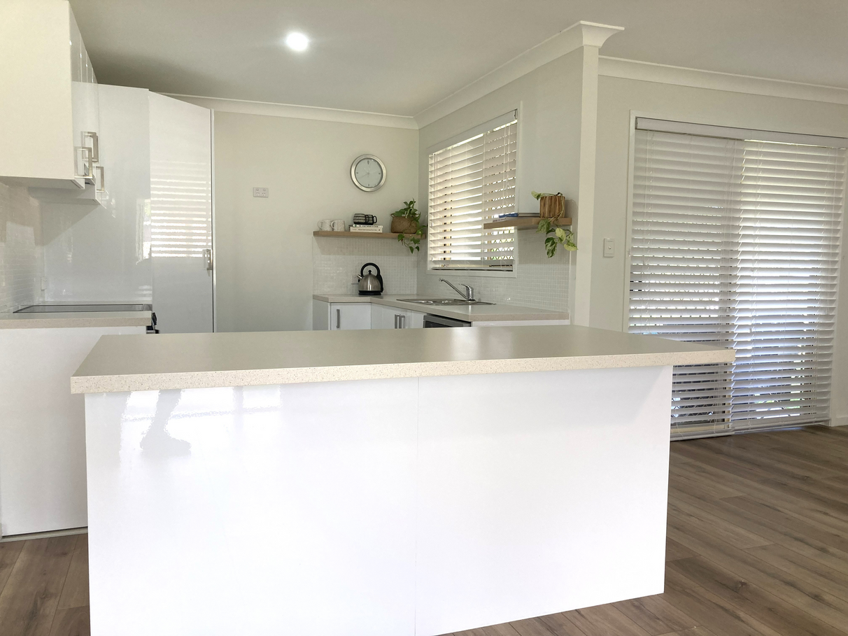 The newly designed kitchen features a large corner pantry with internal light. Plenty of bench space for meal prep and a huge island for sitting around and- if you want- to eat your meals.