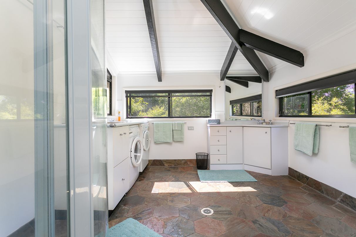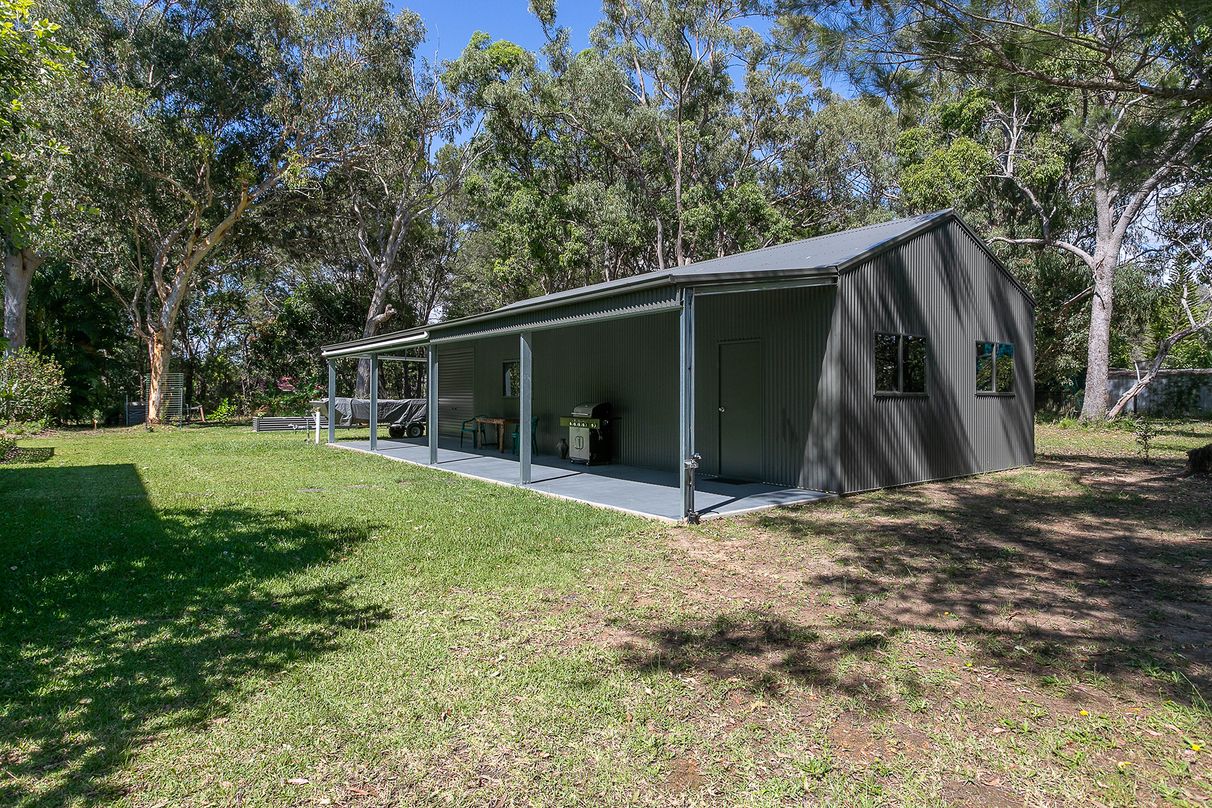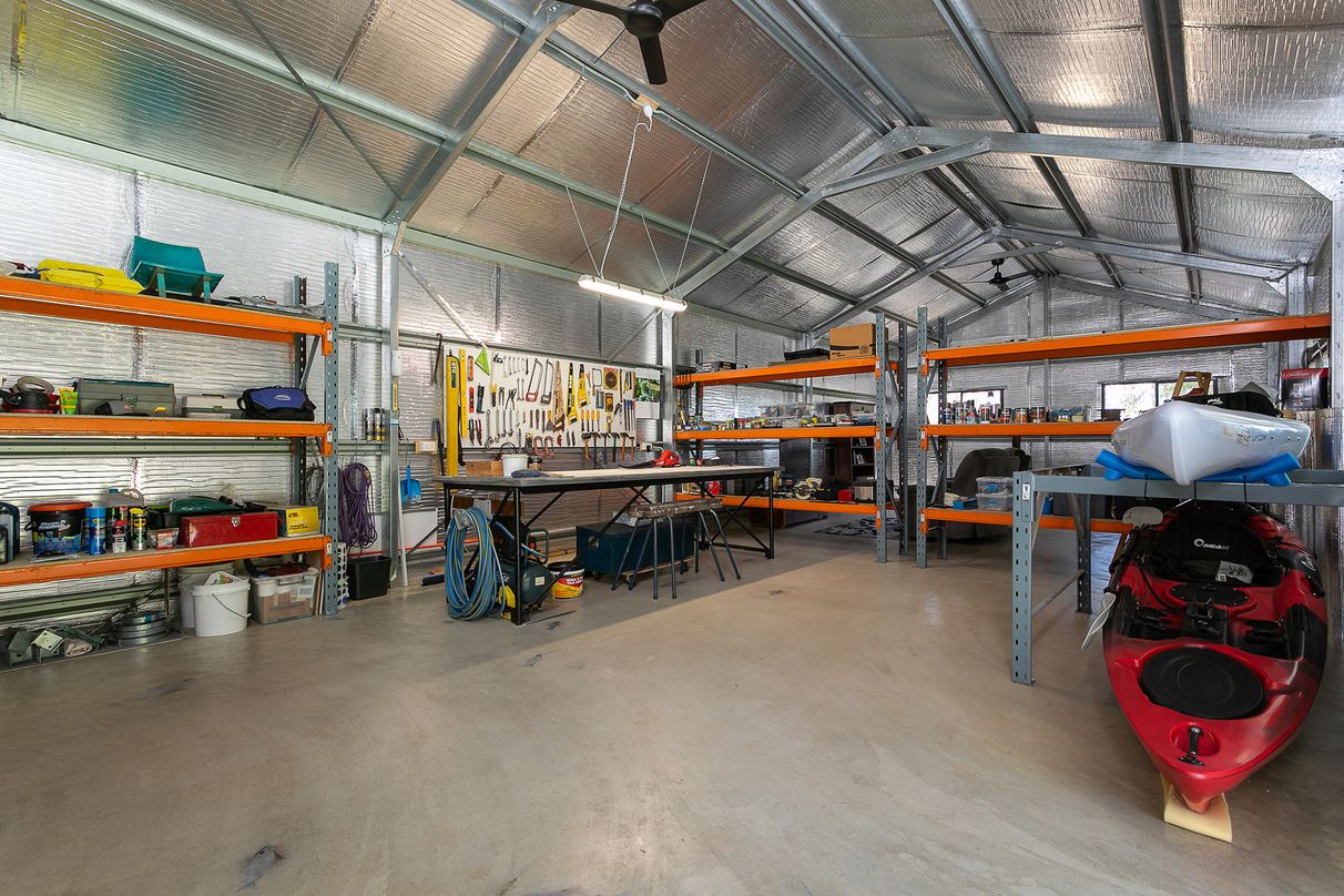 A newly built, fully insulated 15m x 6m steel shed with power on a concrete slab with 15m x 3m covered verandah is divided into a workshop and a potential art studio. The workshop has a roller door and is fitted with industrial shelving and plenty of space for water sports equipment, tools etc. This massive shed presents an opportunity for accommodating extended family or a potential granny flat conversion STCA. Or alternatively, Lot 10 (no. 22), the area of which is 1007m2, could be sold or have family close by independently as the two Lots are amalgamated for rates purposes.