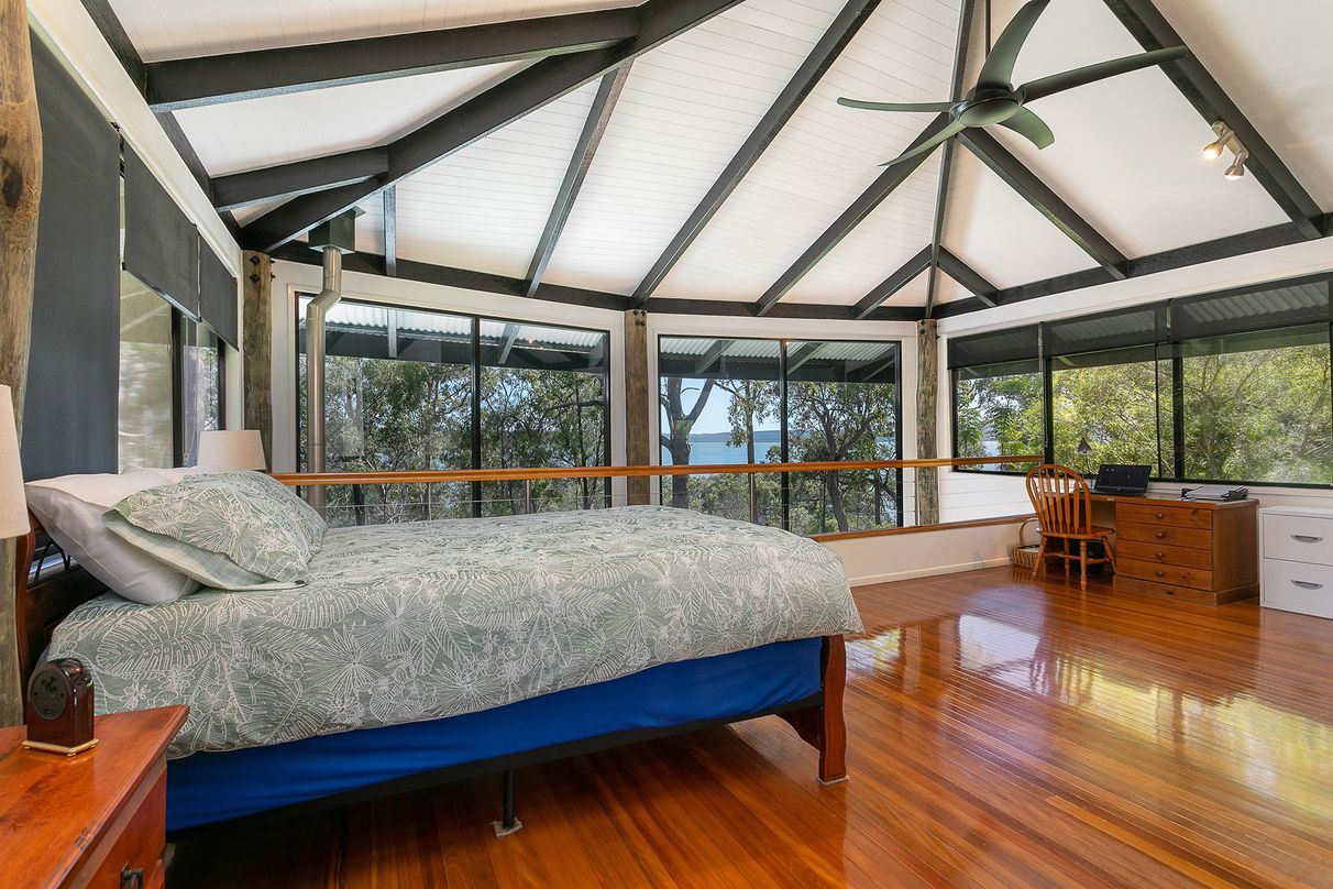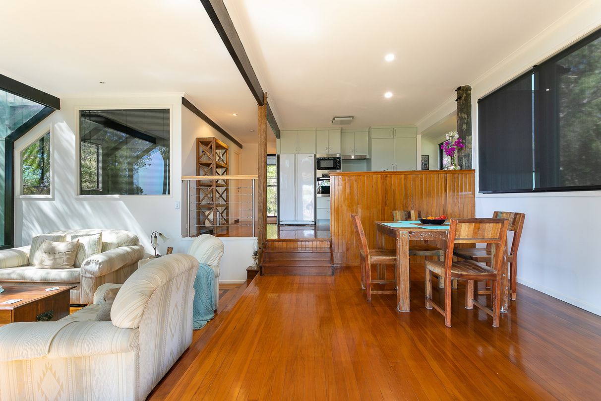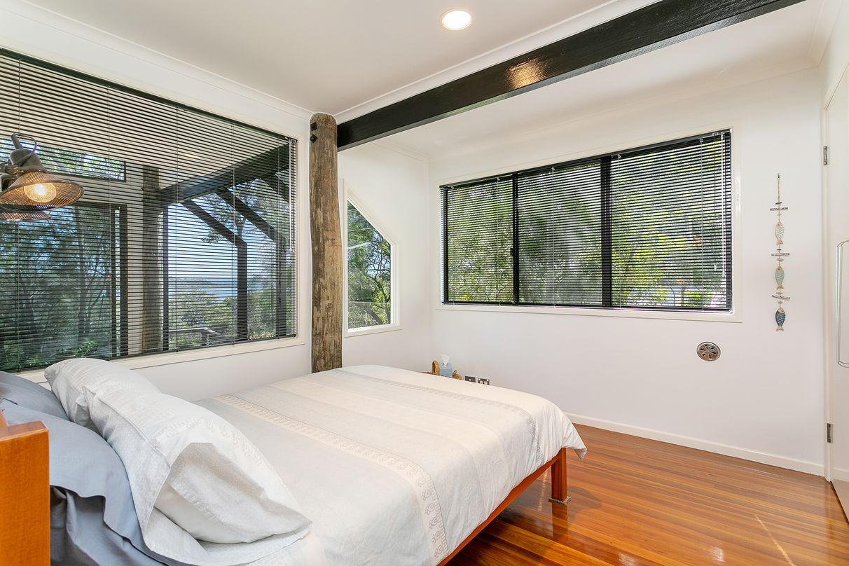 Built at the end of a tree lined driveway with close to half an acre of secluded waterfront land, this stunning three-level pole home was designed by renowned architect Donald Spencer. The design incorporates a breathtaking use of glass to capture spectacular bay views to Stradbroke and Lamb Island and views of the sky through a glass panel in the ceiling. A 10m high cathedral ceiling with exposed beams and polished pink Brush Box hardwood flooring are further outstanding features of the home.