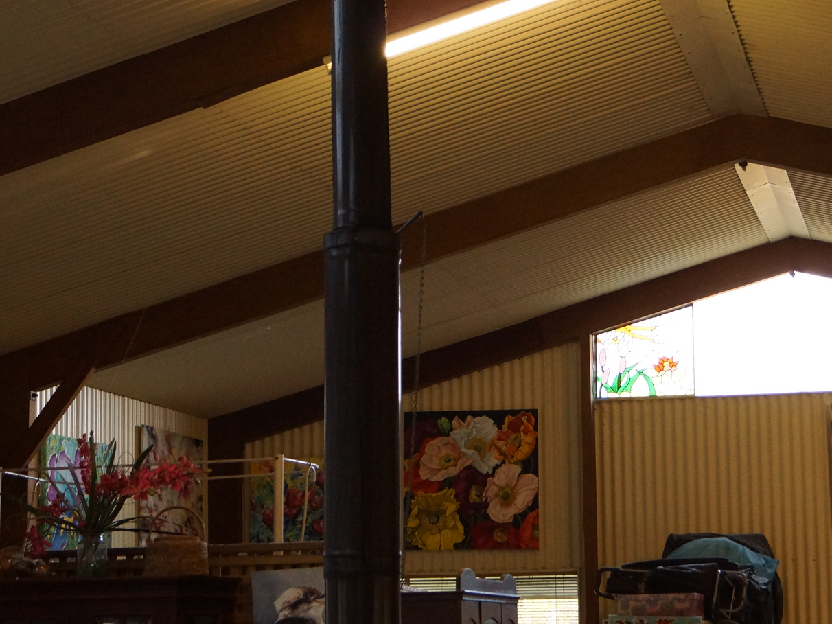 Currently set up as an artists’ residence and studio, this one-of-a-kind 20m x 9m home is metal framed with treated pine internal wall frames. The massive and flexible space is currently configured as multiple living and dining areas plus office and bedroom zones but could easily accommodate a large family and/or business. The dwelling has a bathroom with clawfoot bathtub, shower and separate toilet plus a large laundry and storage/mudroom leading to the external clothes line. With 4.75m to the ceiling peak, there’s even more untapped space to add a central mezzanine level for further floor area.