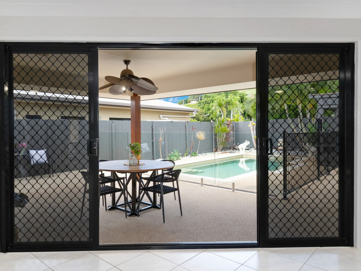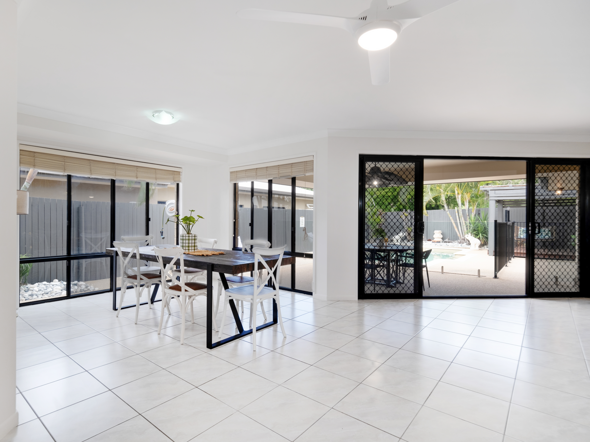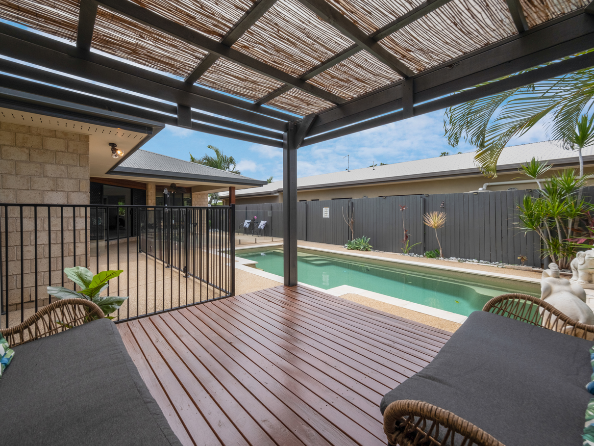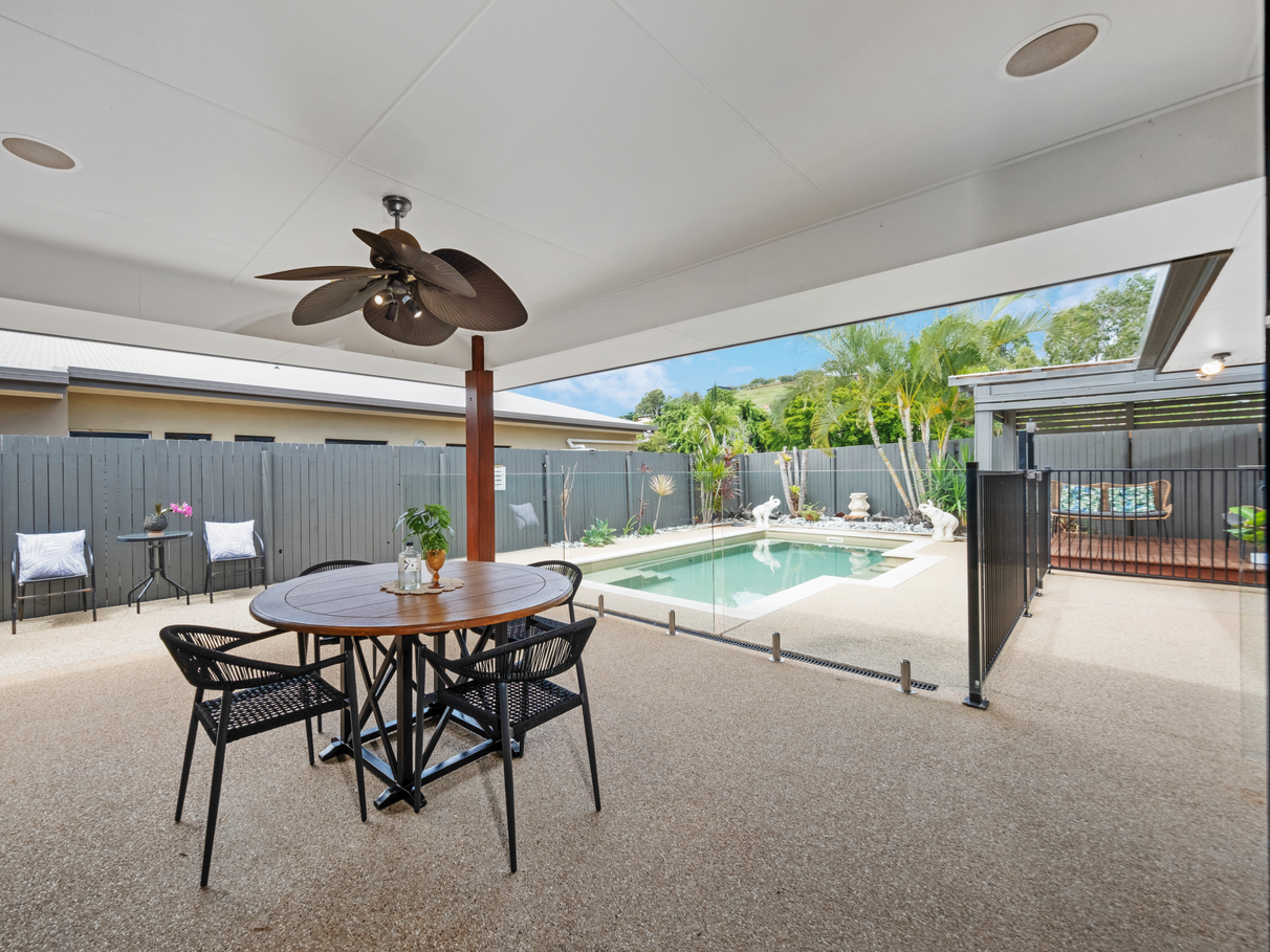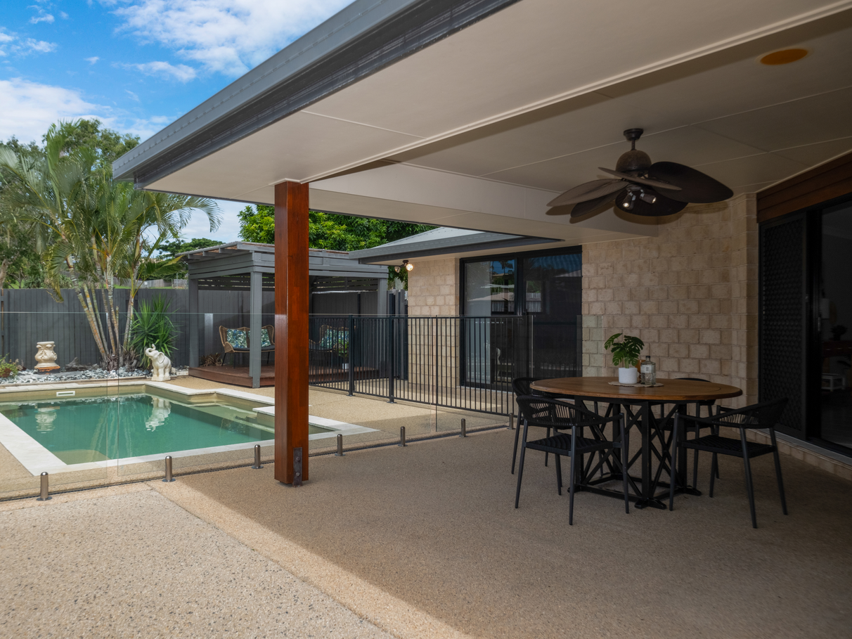 Ample outdoor entertaining area with a ceiling fan & entraining is a breeze on the Deck overlooking Pool, a perfect shady area to enjoy a wine.