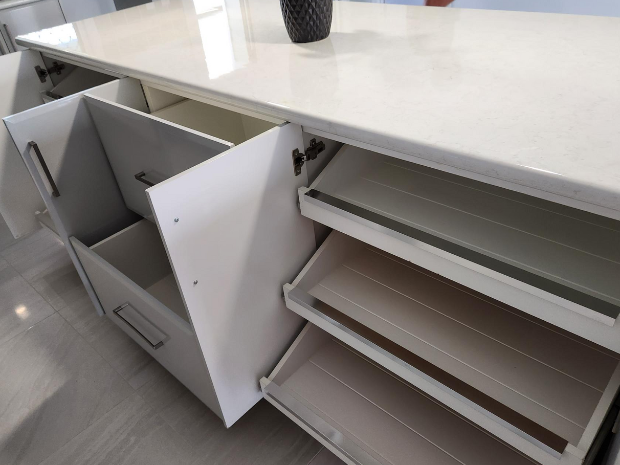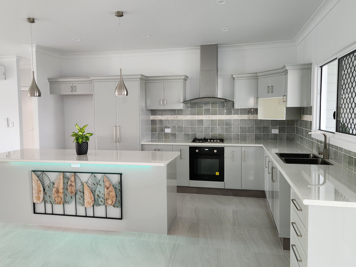 MODERN KITCHEN: The kitchen is a chef's delight, featuring ample storge, two-pack cupboards, an electric oven, a gas cooktop, and water connections for your large fridge.