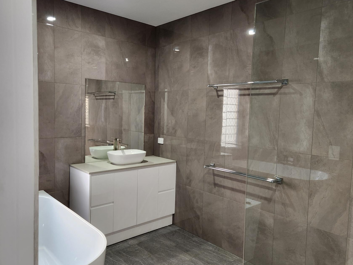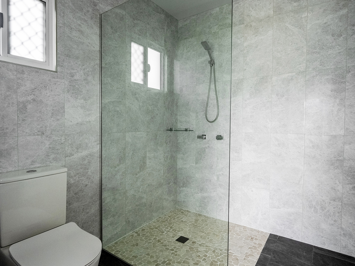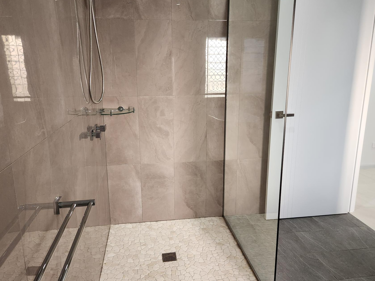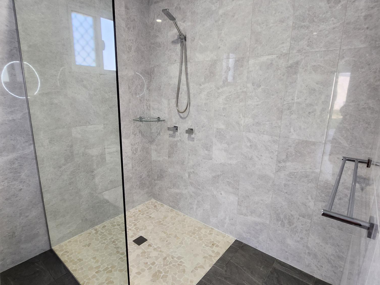LUXURIOUS BATHROOMS: Two stunning modern bathrooms showcase floor-to-ceiling tiling, ensuring complete waterproofing. The spacious, seamless open showers are a delightful indulgence.