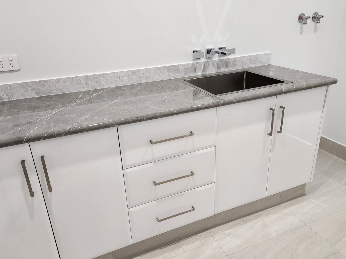 CONVENIENT LAUNDRY: The large laundry room comes equipped with cabinets and a practical benchtop making laundry chores a breeze.