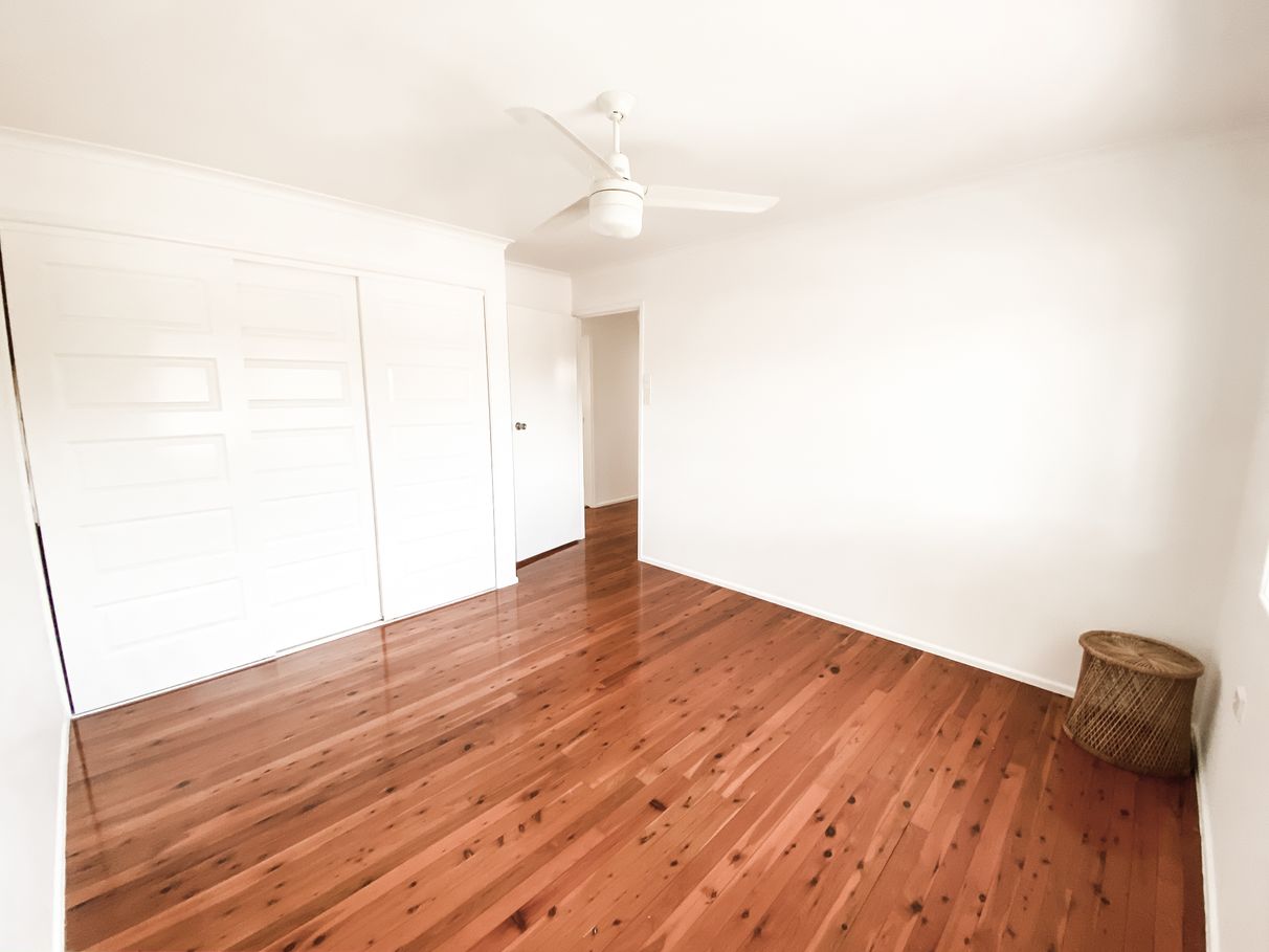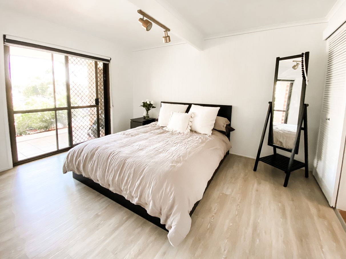 The master bedroom is located on the lower level with feature cladding and newly installed custom cabinetry maximising storage.