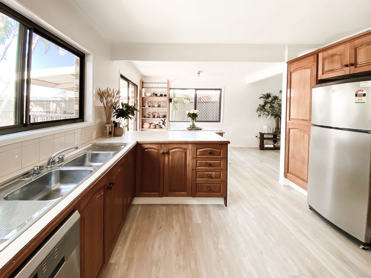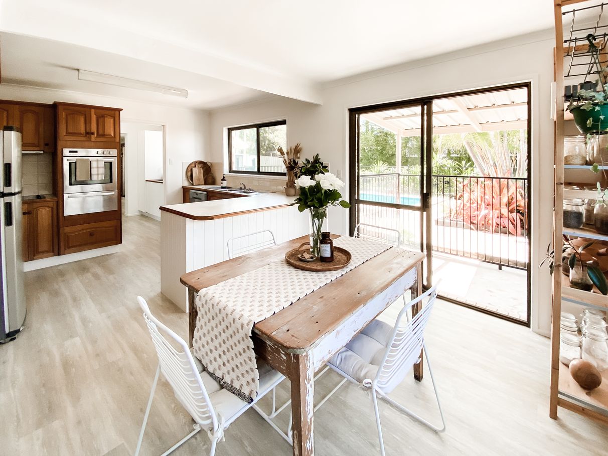 The timber kitchen and seperate dining in the heart of the home have the perfect view out over the tropical pool area.