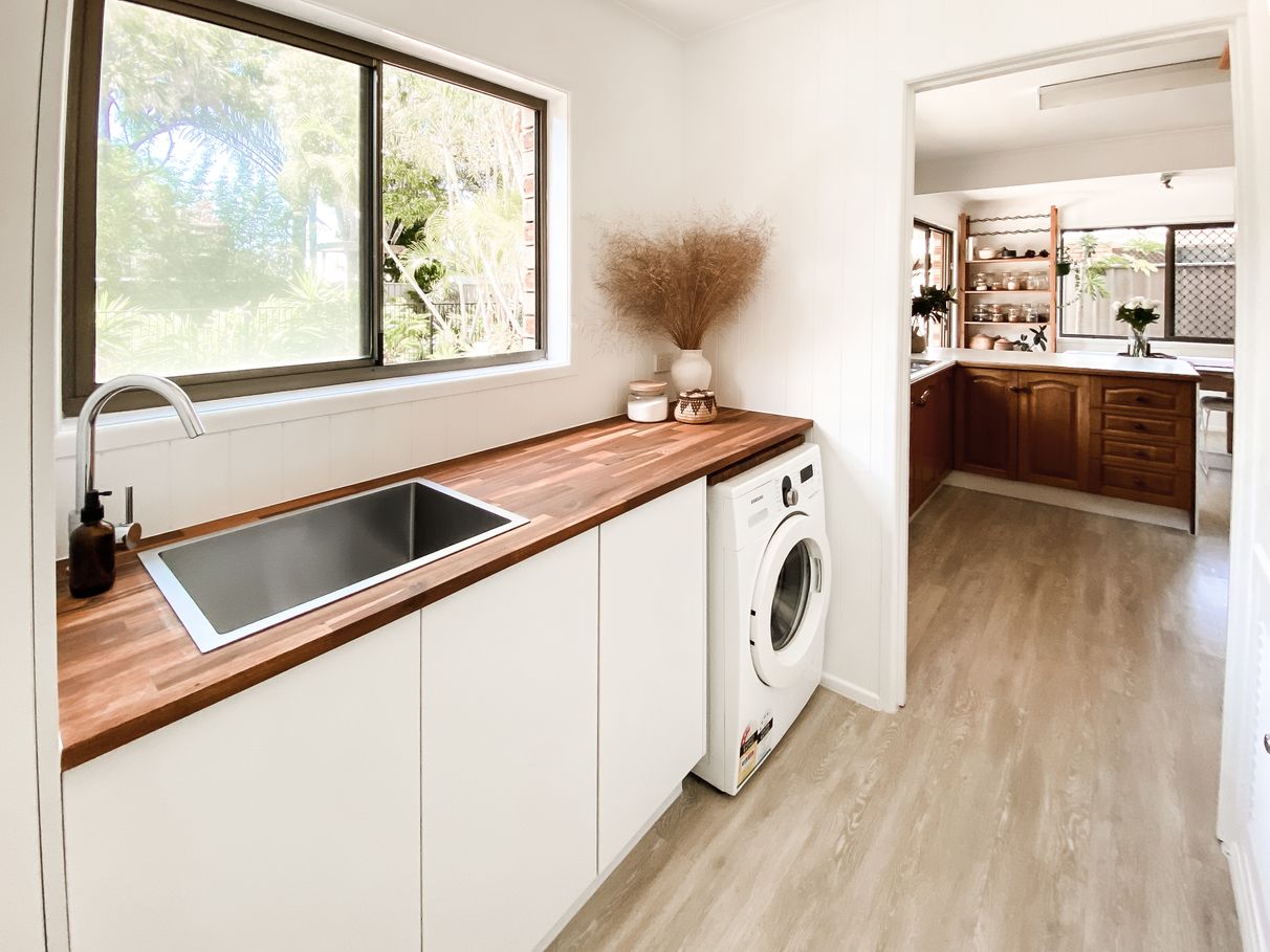Beautifully finished with timber bench top and wall panelling, the laundry will make doing the washing a delight.