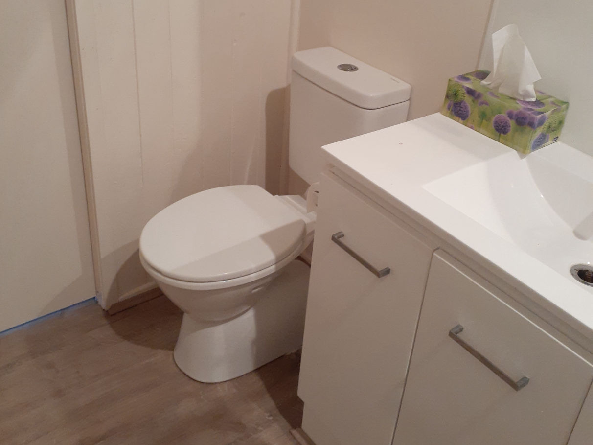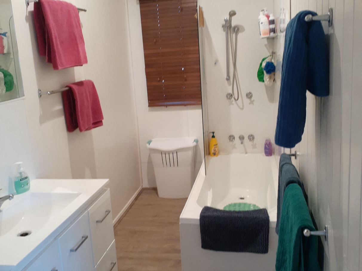 The renovated bathroom contains a modern vanity, shower over the bath, toilet, extractor fan and heat lights.