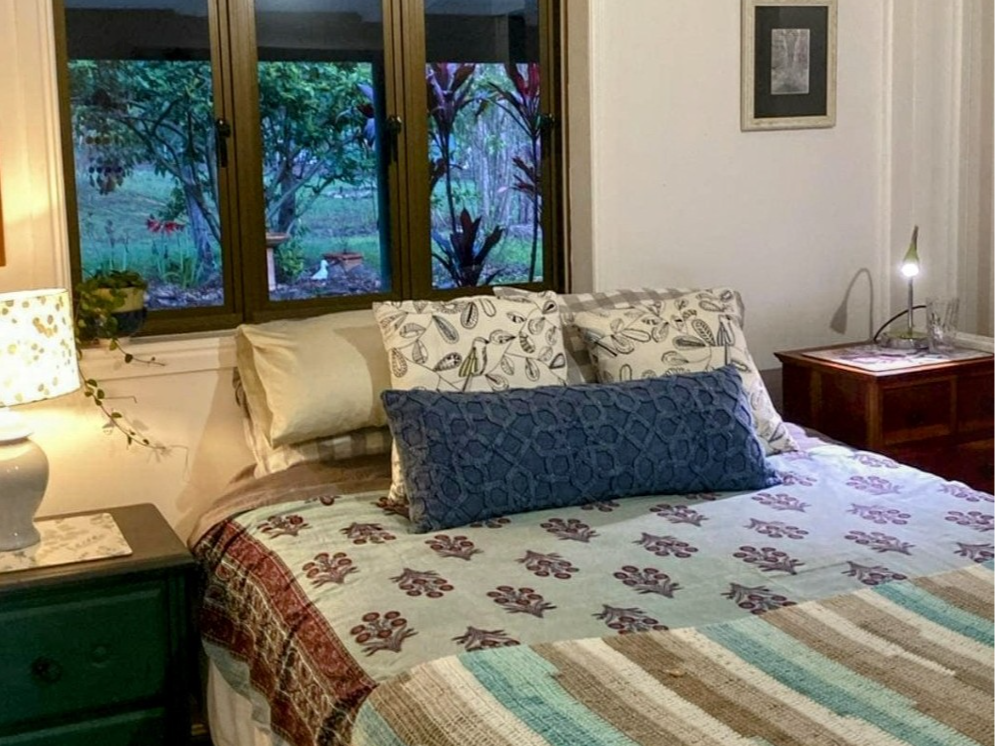 We have developed various garden areas around the house and barn and have kept the natural lightly wooded areas. The gardens between the house and the barn space give the spaces privacy. The side garden has a small chook area and combined woodshed. There is also a larger chook structure which could be returned to its original function of shaded vegetable growing space. There are two large recycled, raised veggie beds and a variety of tropical fruit trees to the kitchen garden. The dam which is aside of the kitchen veggie area, attracts seasonal migrating birds and homes three farm Pekin ducks, one male and two female.