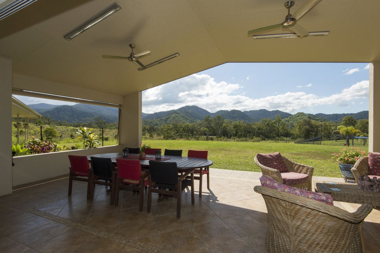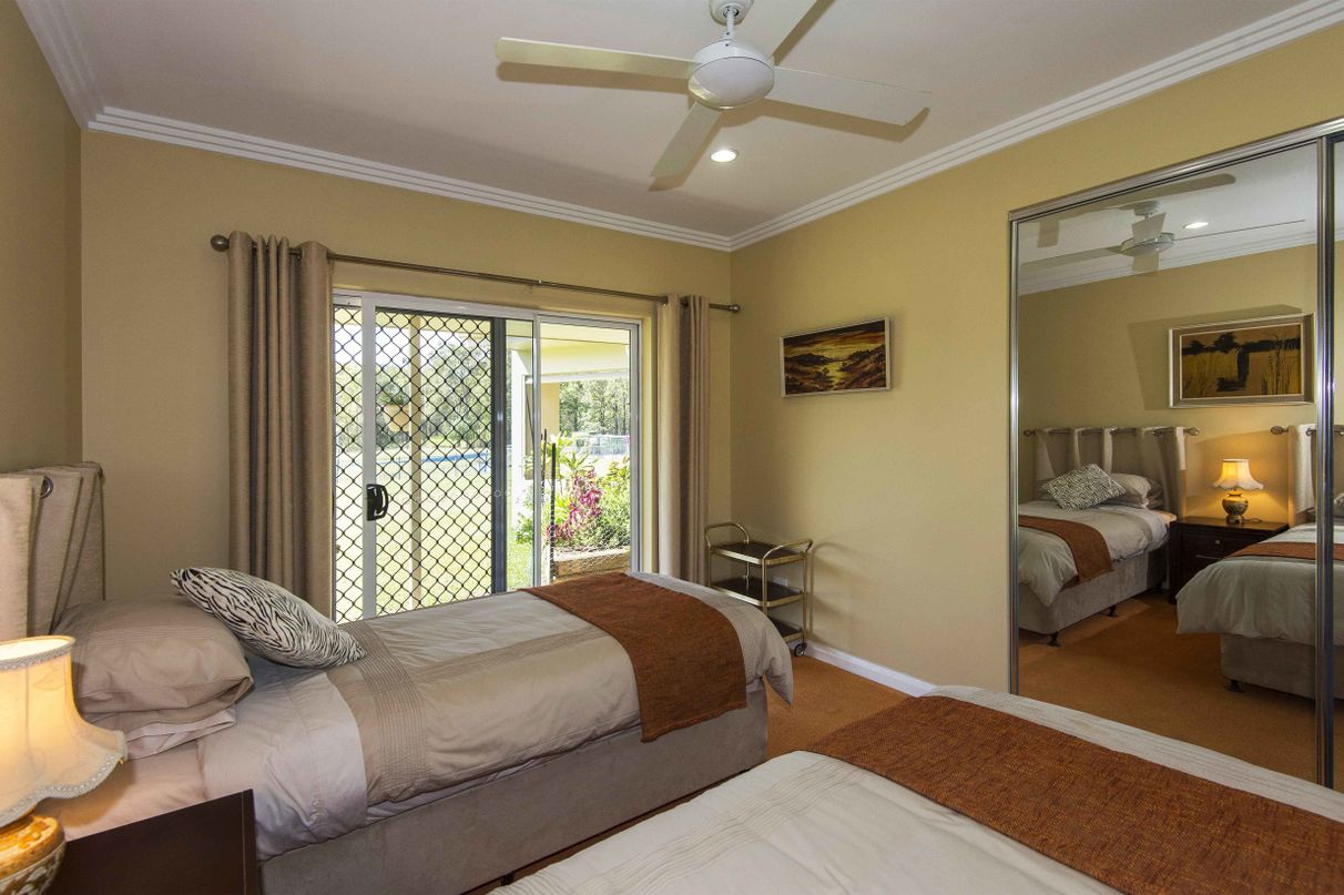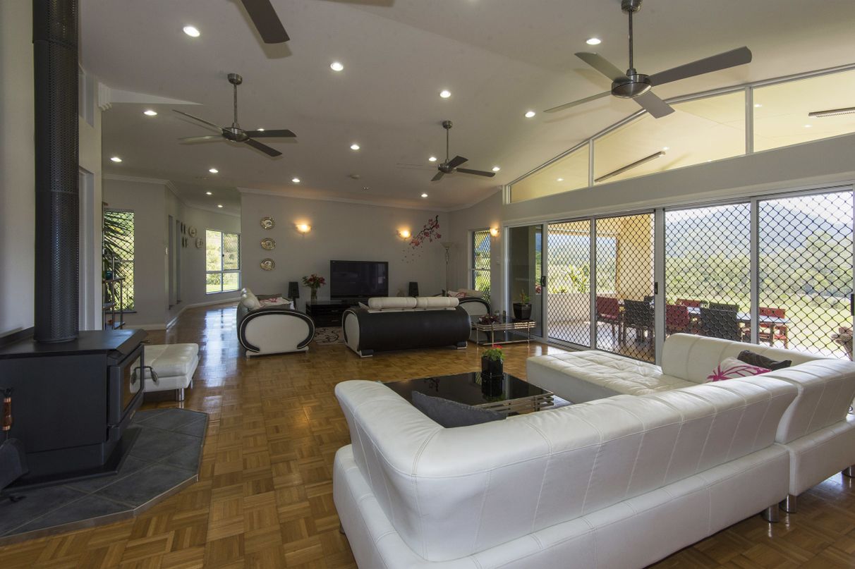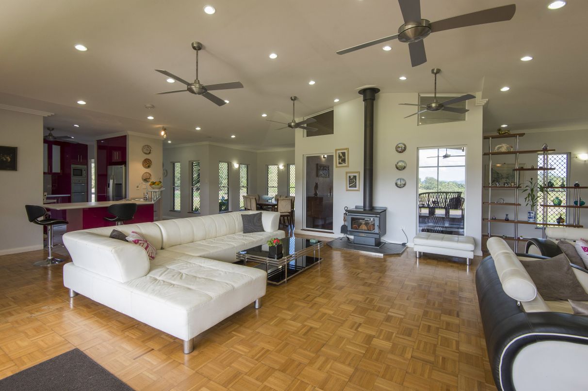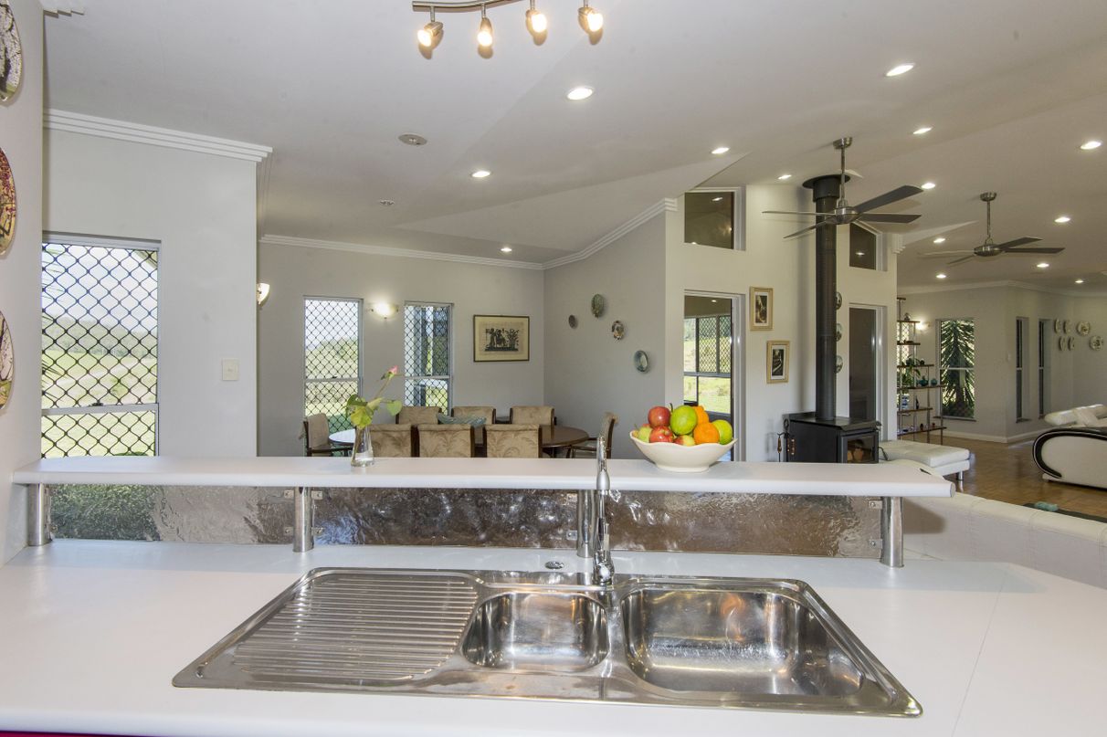 HILL HOUSE – Built high on a hill in a quiet corner of the beautiful Pioneer Valley at Gargett, near Mackay is this architecturally designed 4 bedroom home with separate one bedroom granny flat, workshop and more. Environmentally designed to be cool in summer and warm in winter this spacious home has four bedrooms, two with ensuites and Walk in Robes, separate family bathroom with spa, a sunroom, a large kitchen-dining-living area plus a spacious patio overlooking the in-ground pool in a resort style setting. 5 acres total land area. 500 sq metres under roof. Solar hot water systems plus a 4.2 KVA solar system service this rendered block built home along with many other high specification features.