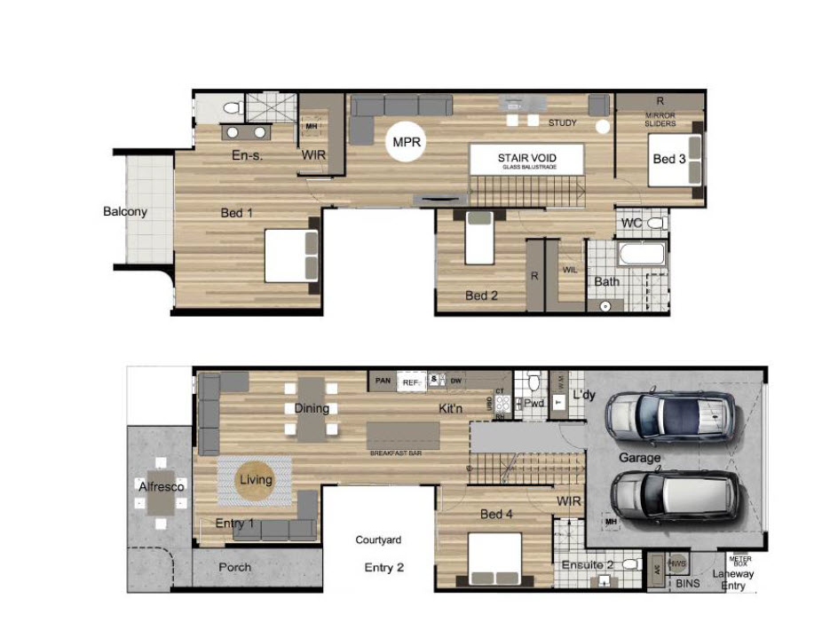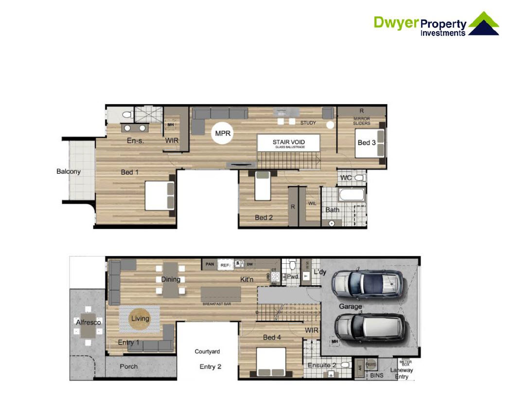 4 bedroom, 2 with ensuites + media or study, 3 bathrooms, split level terrace home