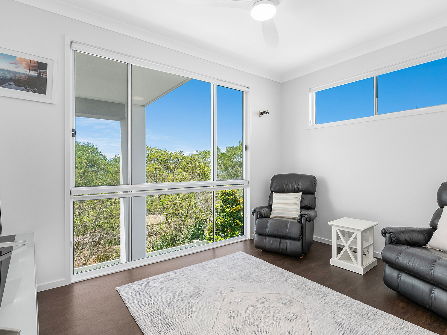 This architectural gem boasts four spacious bedrooms, three luxurious bathrooms, a powder room, a versatile study/media room, and a multi-purpose ground-floor space—perfect for a home office or guest retreat. The master suite is a sanctuary, featuring floor-to-ceiling glass that frames mesmerizing water views, a sprawling walk-in robe, and a spa-like ensuite. The top floor is an entertainer’s dream, with soaring ceilings and an open-plan living area that flows seamlessly to a north-facing balcony—ideal for sunrise coffees, sunset BBQs, or watching yachts glide by. A south-facing Juliette balcony adds charm, offering mountain views and a front-row seat to Paradise Point’s fireworks displays.