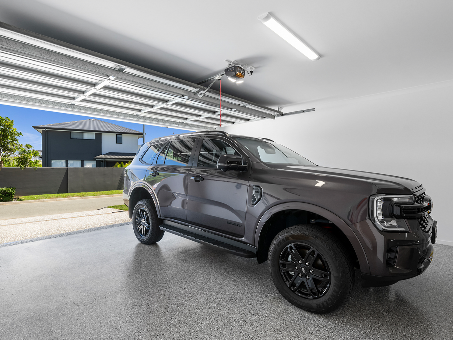 Beautifully finished double garage with workshop and storage all with sealed flooring and added extra room