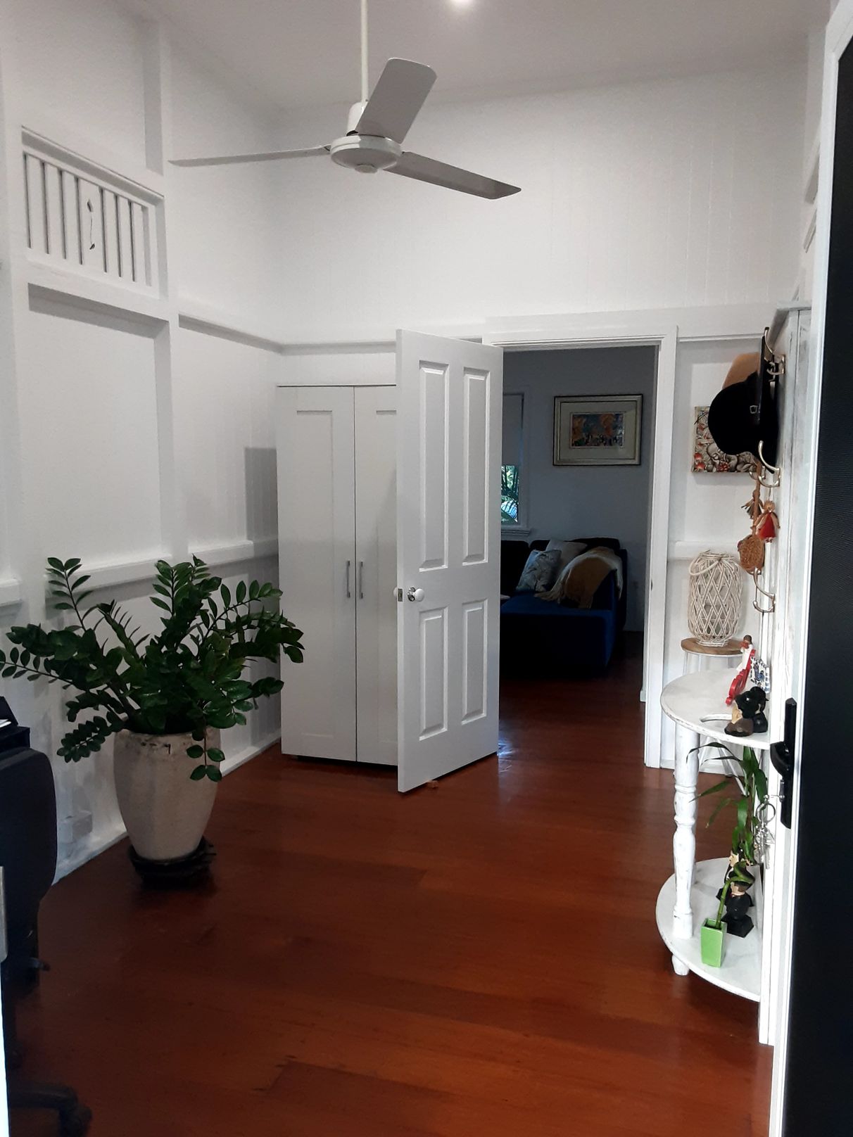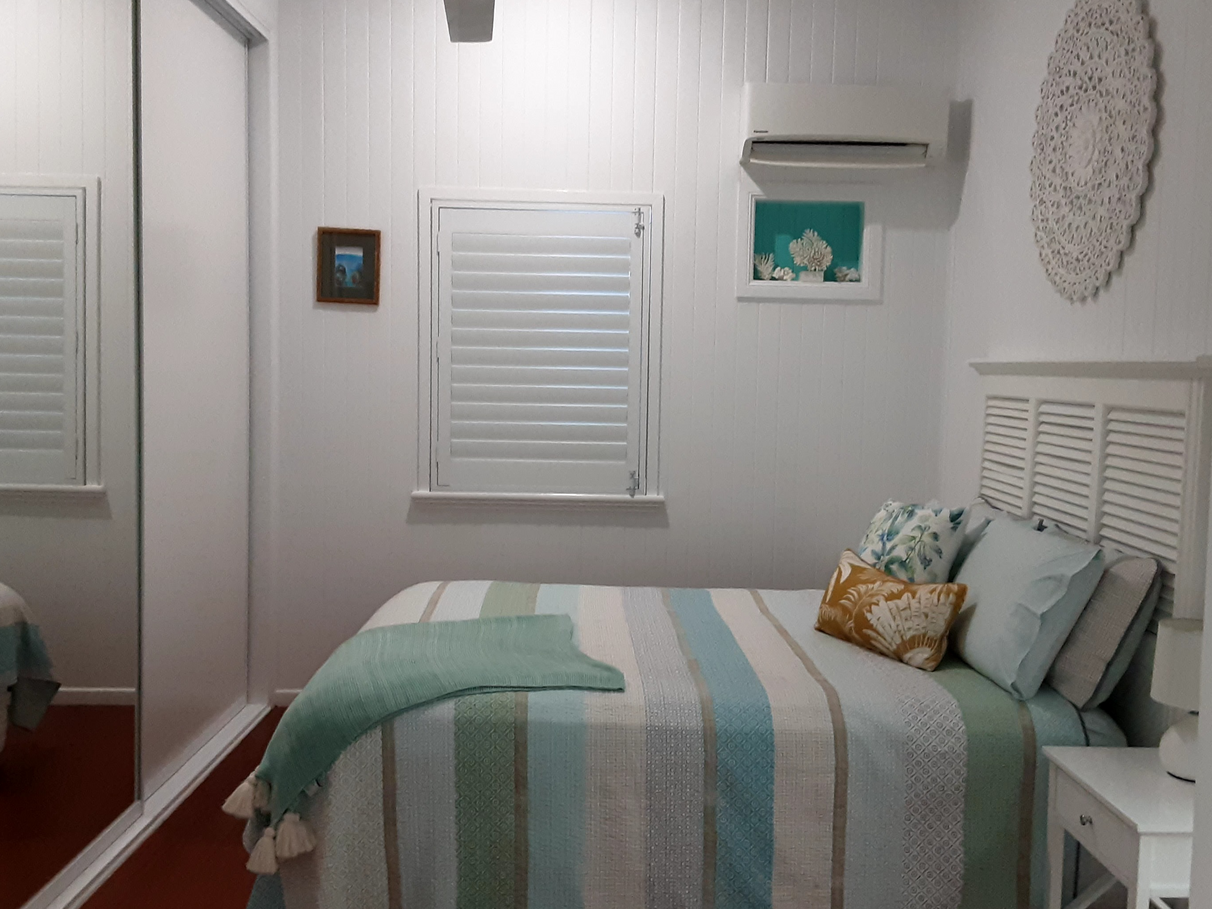 Master bedroom upstairs with huge wall to wall wardrobe, plantation blinds and modern adjoining bathroom.