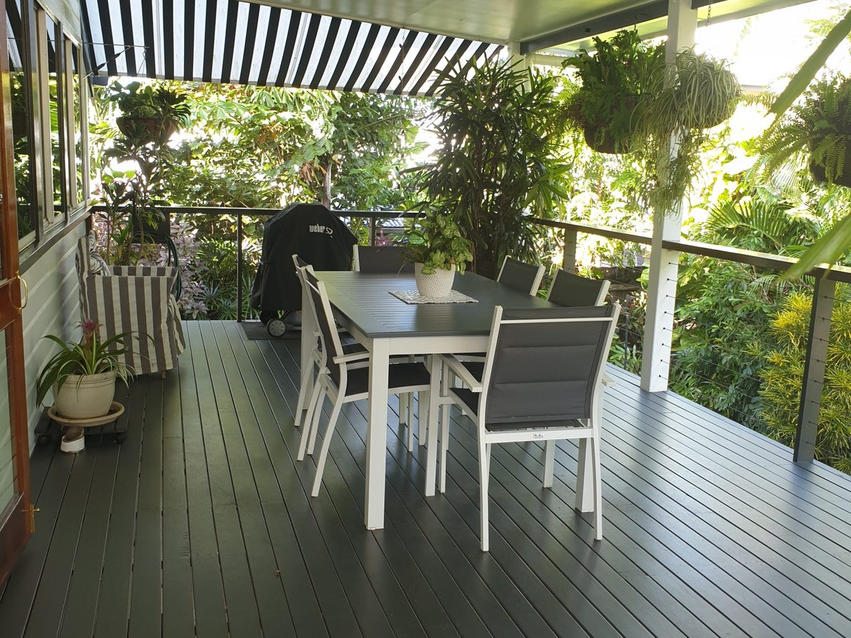 Large outdoor deck to relax and entertain. Enjoy the breezes, tropical gardens and delightful sounds of the birds. Sketch, paint, read or just chill out to some relaxing music.