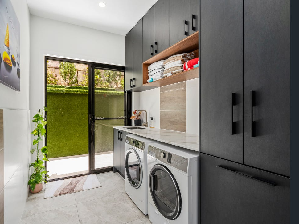 The stunning chef’s kitchen with water fall stone benchtops encase the kitchen perfectly with the two-tone modern wood finished cabinetry, built in Bosh dishwasher, built in double french door fridge and slide draw freezer, built in Bosh convection microwave oven, 600ml Bosh gas stove with Bosh range hood and two Bosh wall ovens perfect for entertaining.