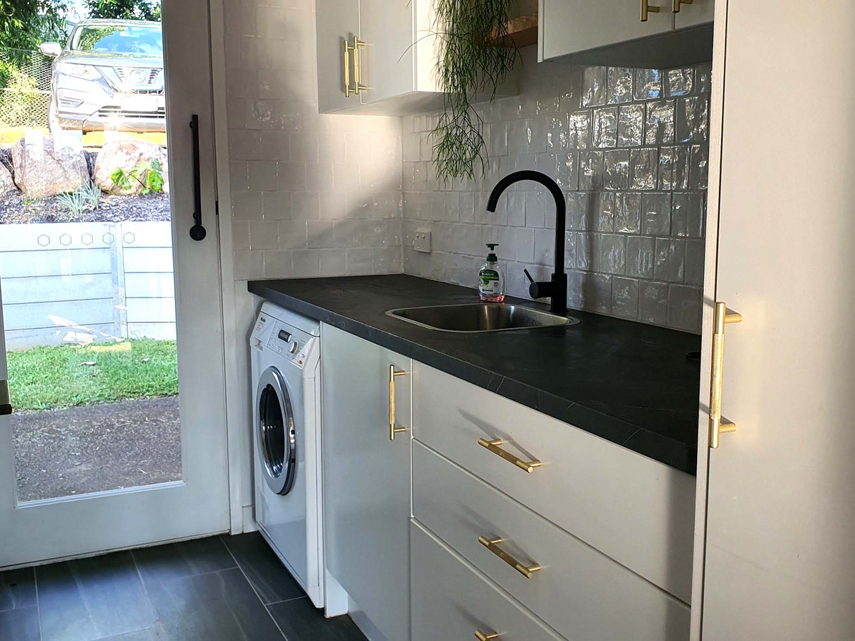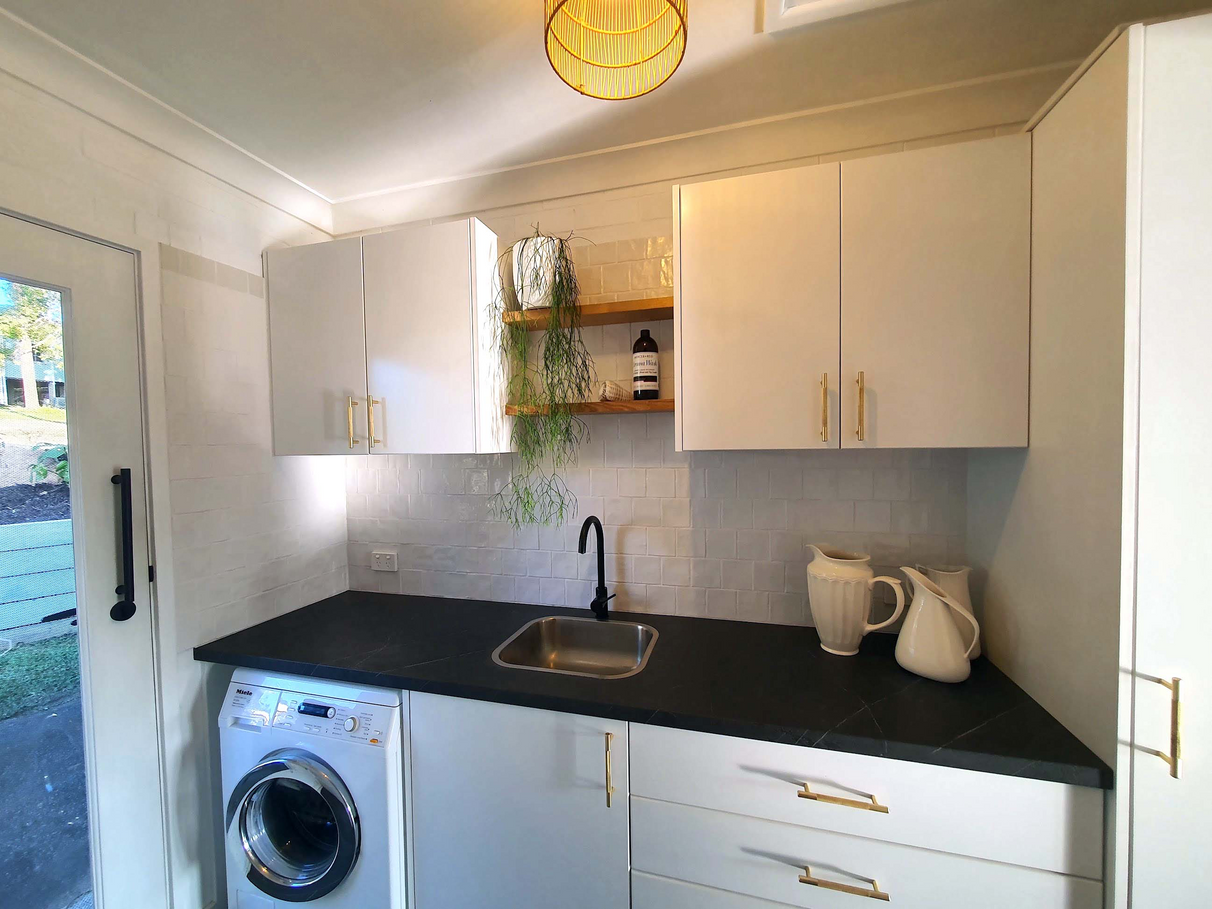 A laundry with abundant storage, two separate toilets, and a family-sized bathroom