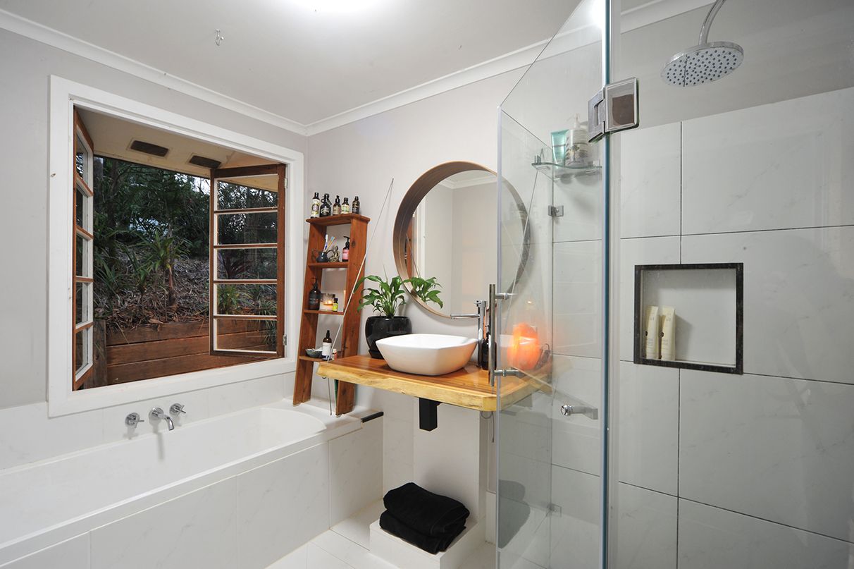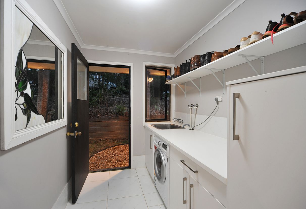 Comprising three generous bedrooms with large built-in robes, and a brand new, rustic inspired family bathroom with slate tile features, French windows by the large bath, separate toilet and an excellent laundry with large built-in bench, storage/shelving.