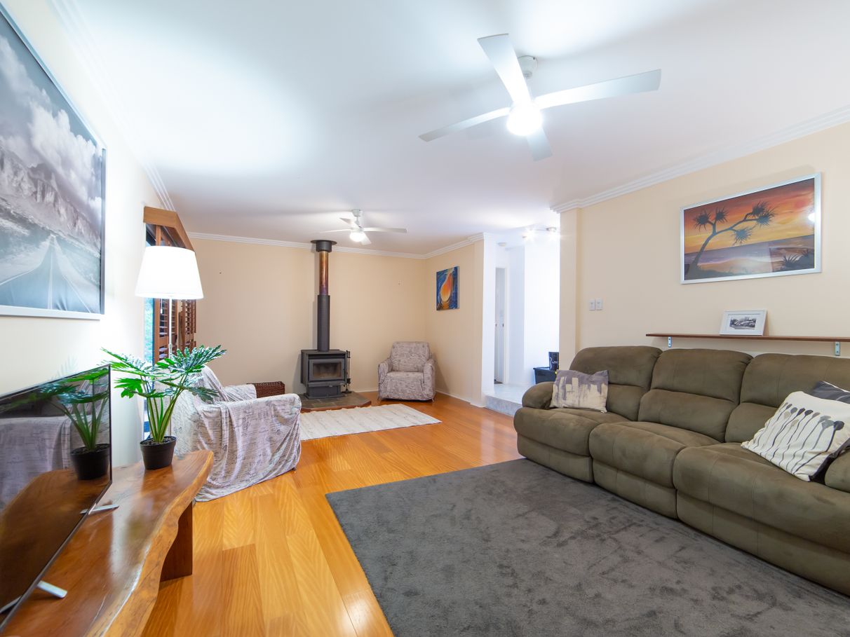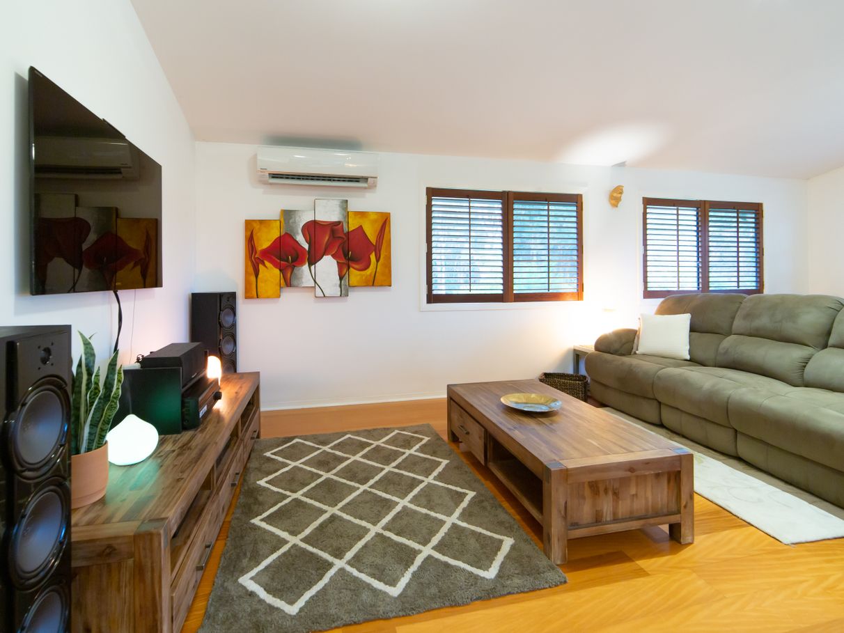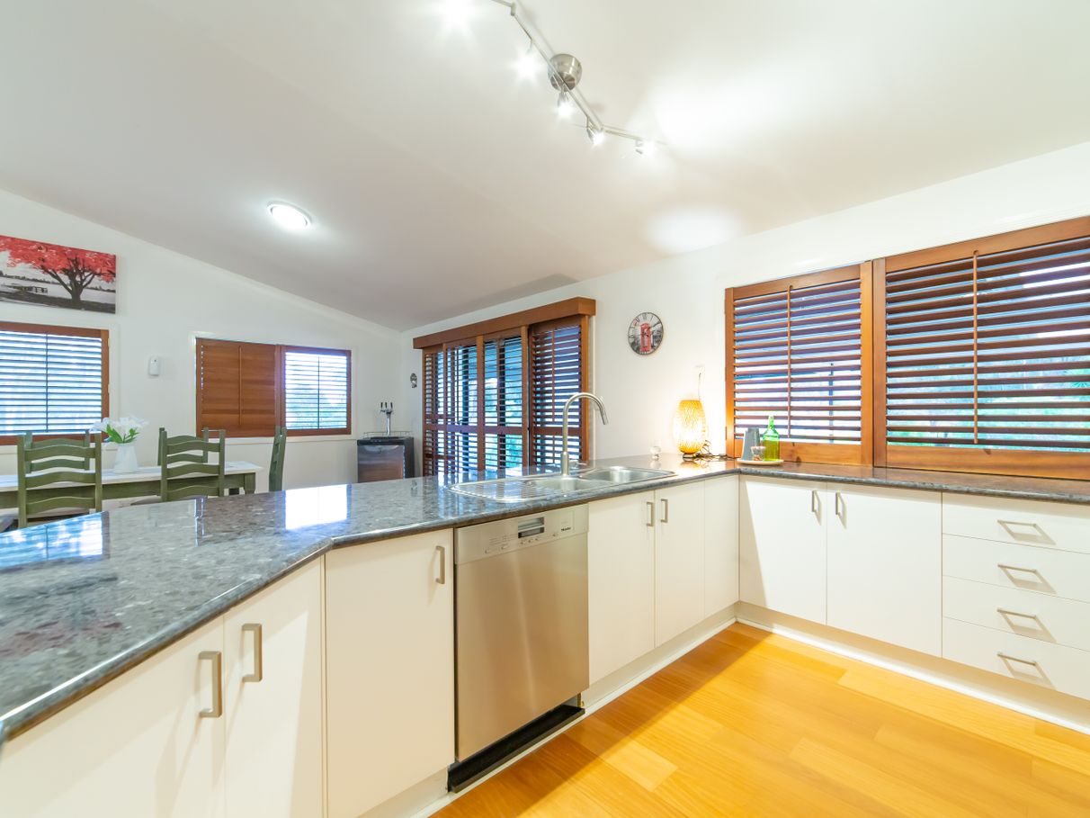 There are 5 bedrooms in total, including large master with ensuite, spa bath, double vanity plus a walk-in robe. The sunken formal lounge has a wood-burning heater and patio doors. The open plan living area has a large modern kitchen, dining room and informal lounge with floating timber floors and plantation shutters. There is also a recently renovated 5th bedroom/studio or “grandparents retreat” at the front with NEW KITCHENETTE, LAUNDRY, AC and own ENTRY door. This could serve as an independent living area, ideal for older children or perhaps an elderly parent or Air BnB options.