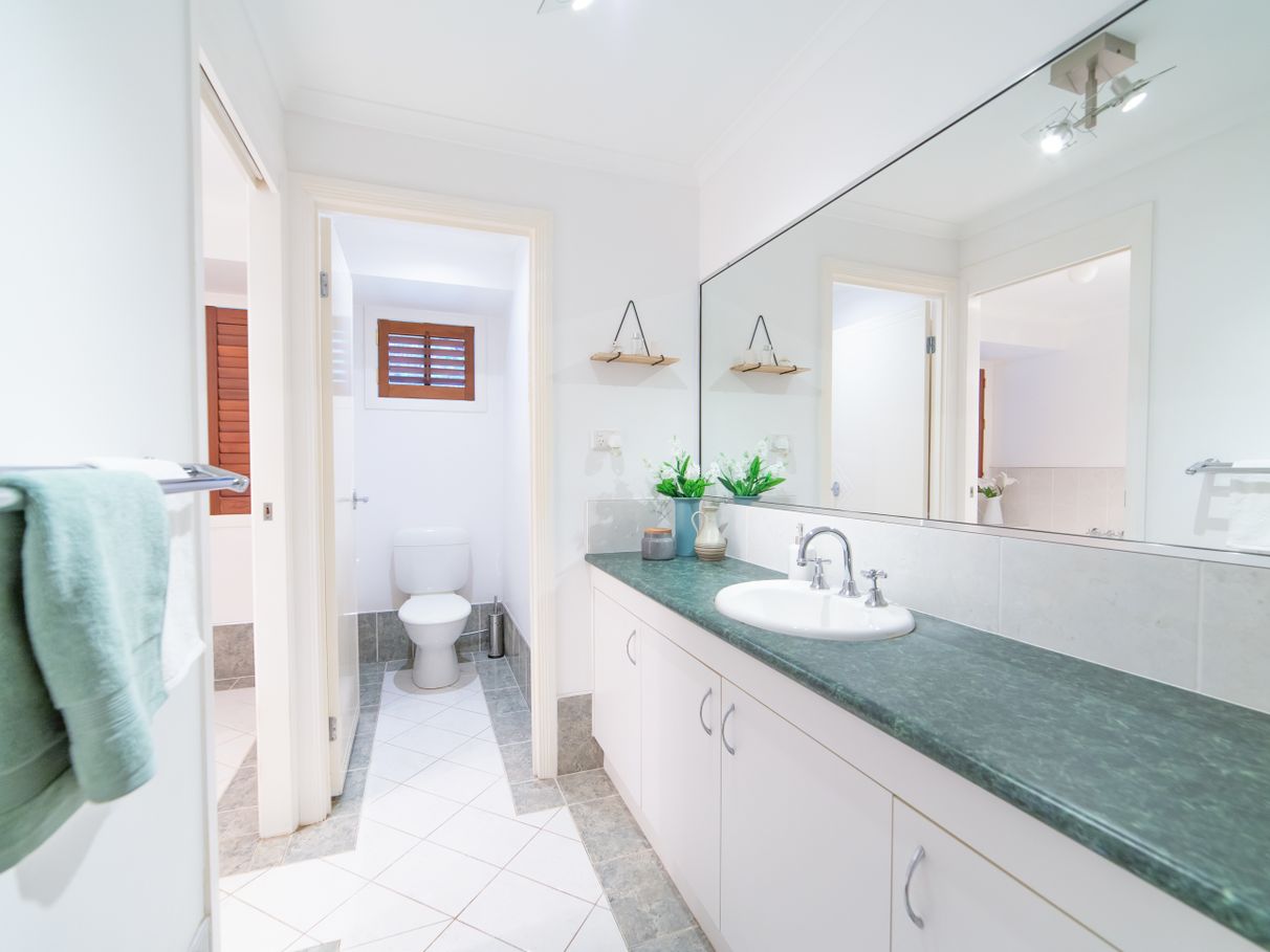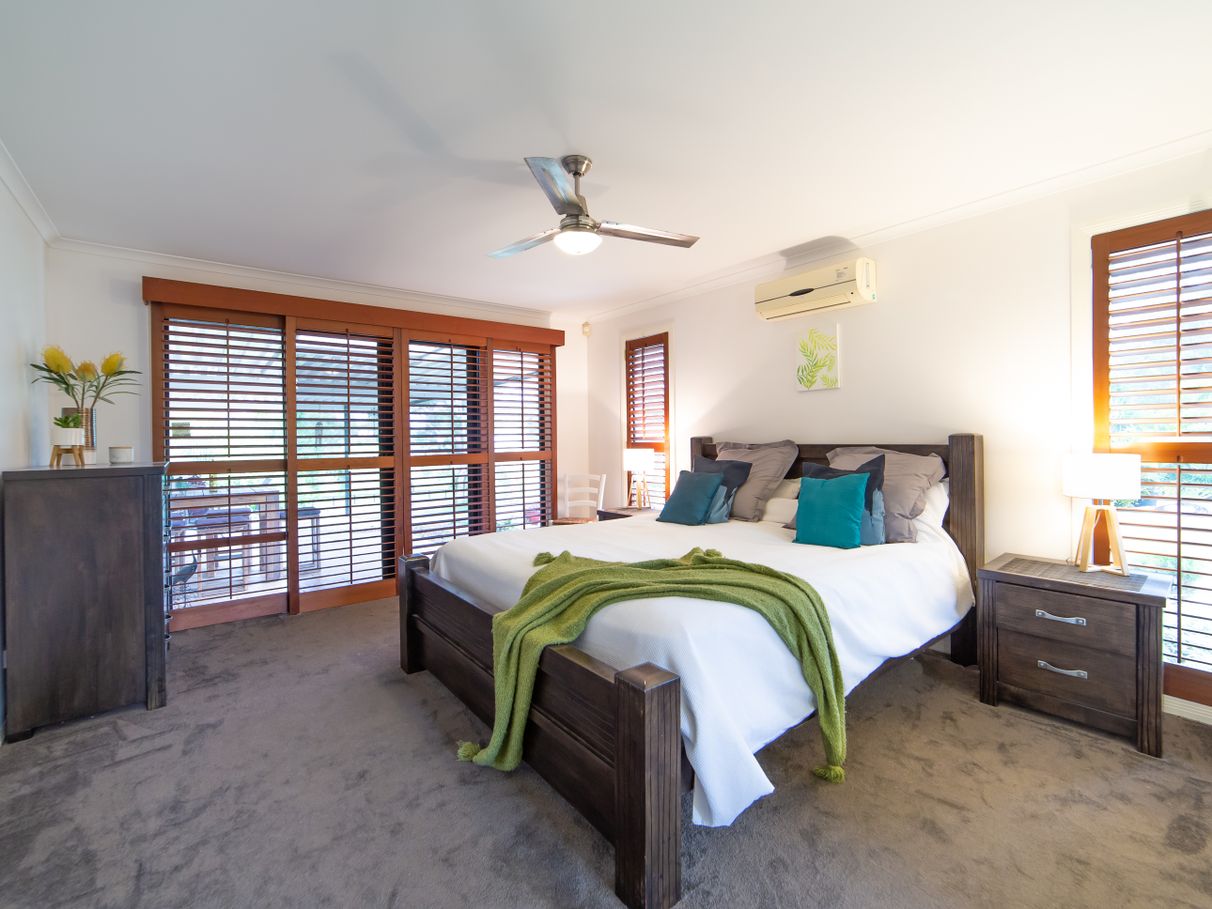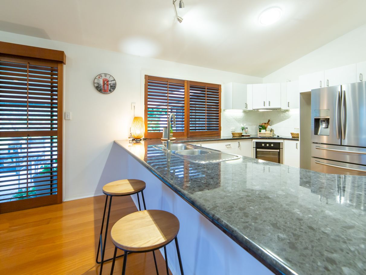 There are 5 bedrooms in total, including large master with ensuite, spa bath, double vanity plus a walk-in robe. The sunken formal lounge has a wood-burning heater and patio doors. The open plan living area has a large modern kitchen, dining room and informal lounge with floating timber floors and plantation shutters. There is also a recently renovated 5th bedroom/studio or “grandparents retreat” at the front with NEW KITCHENETTE, LAUNDRY, AC and own ENTRY door. This could serve as an independent living area, ideal for older children or perhaps an elderly parent or Air BnB options.