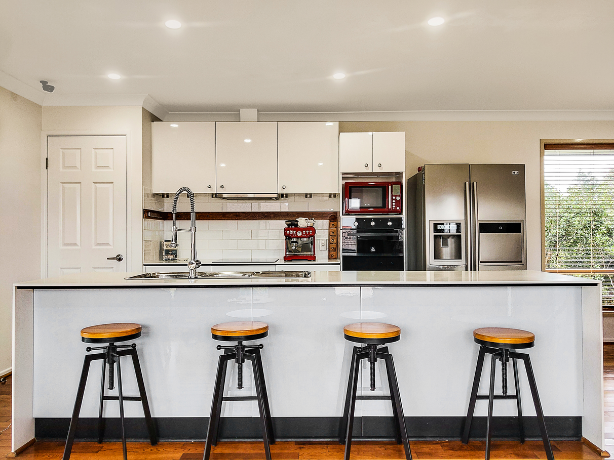 The open plan living is centred around a gourmet gallery style kitchen showcasing stone benchtops flowing out to one of two north facing outdoor entertaining areas.