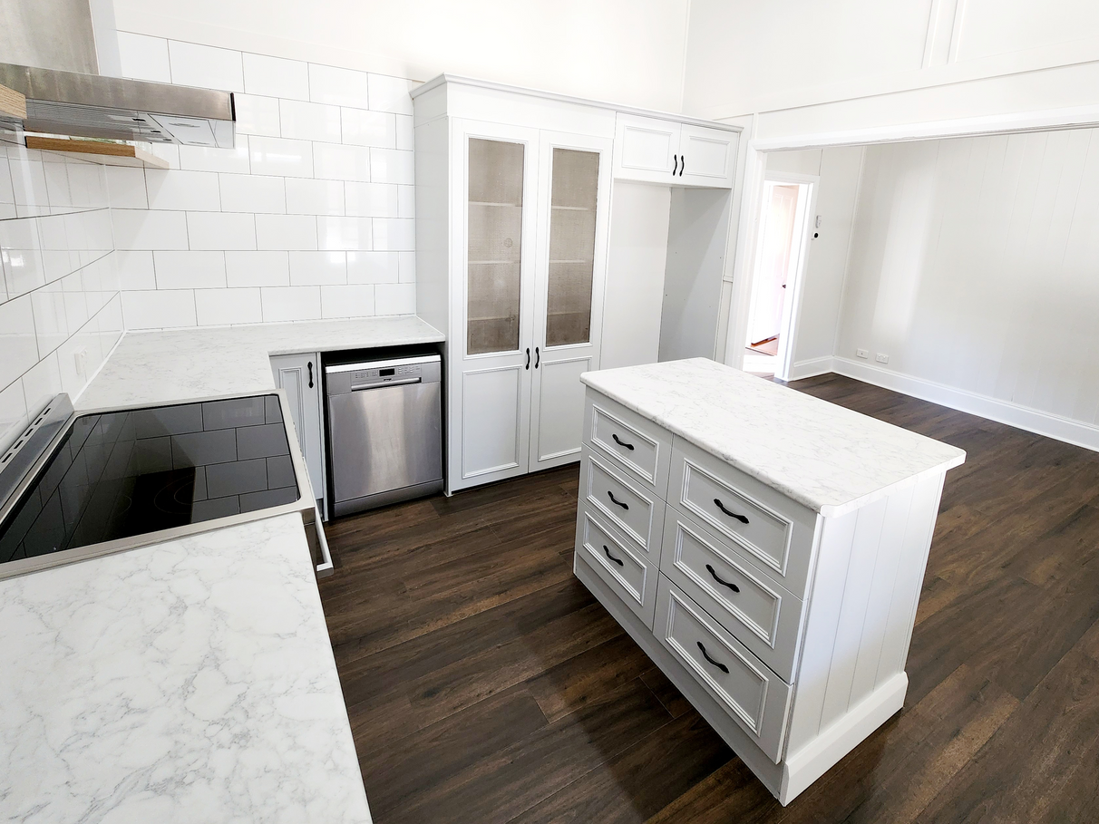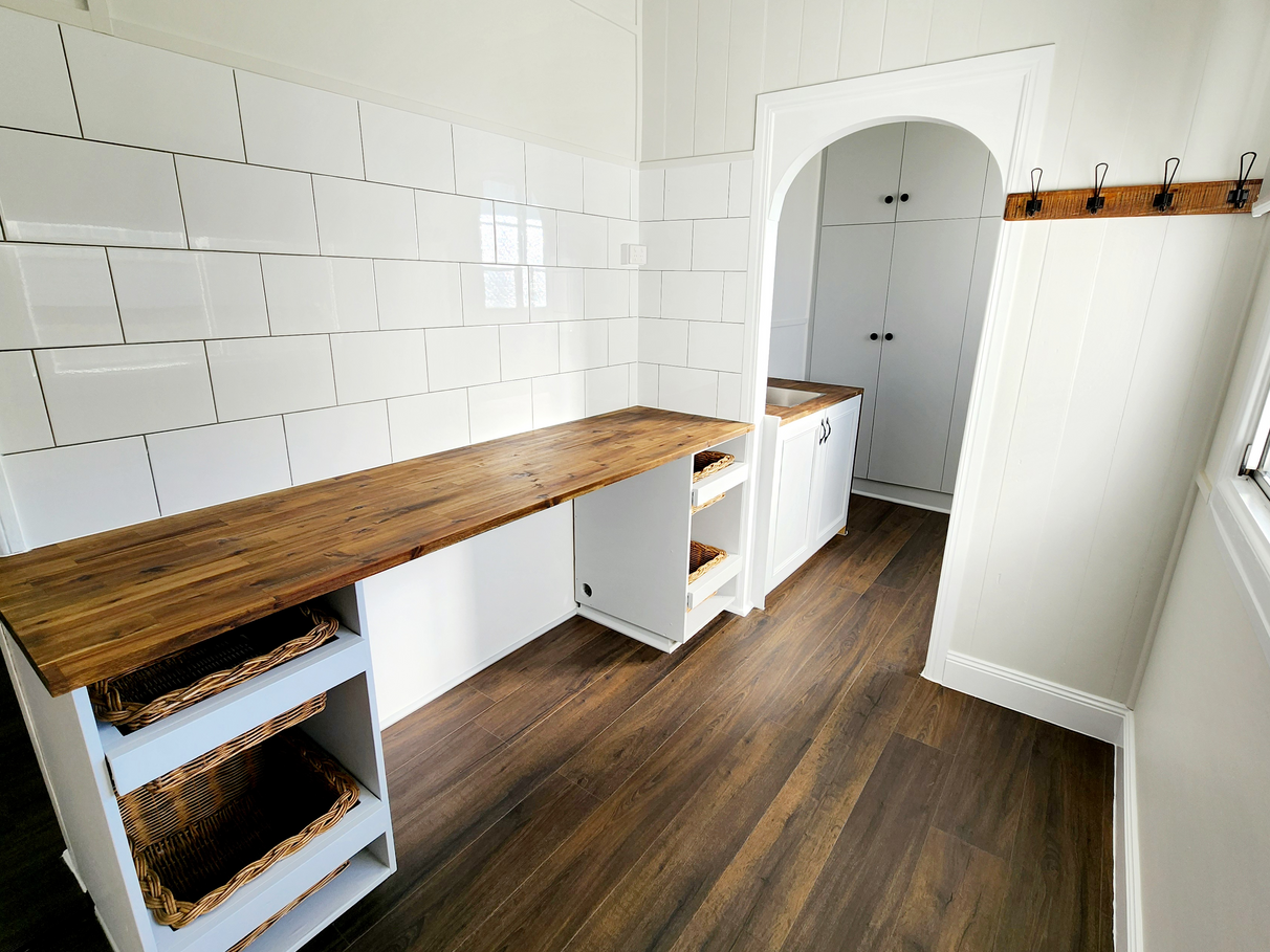 Kitchen with 900mm oven/hub with range hood, original panty, island workspace with additional storage.