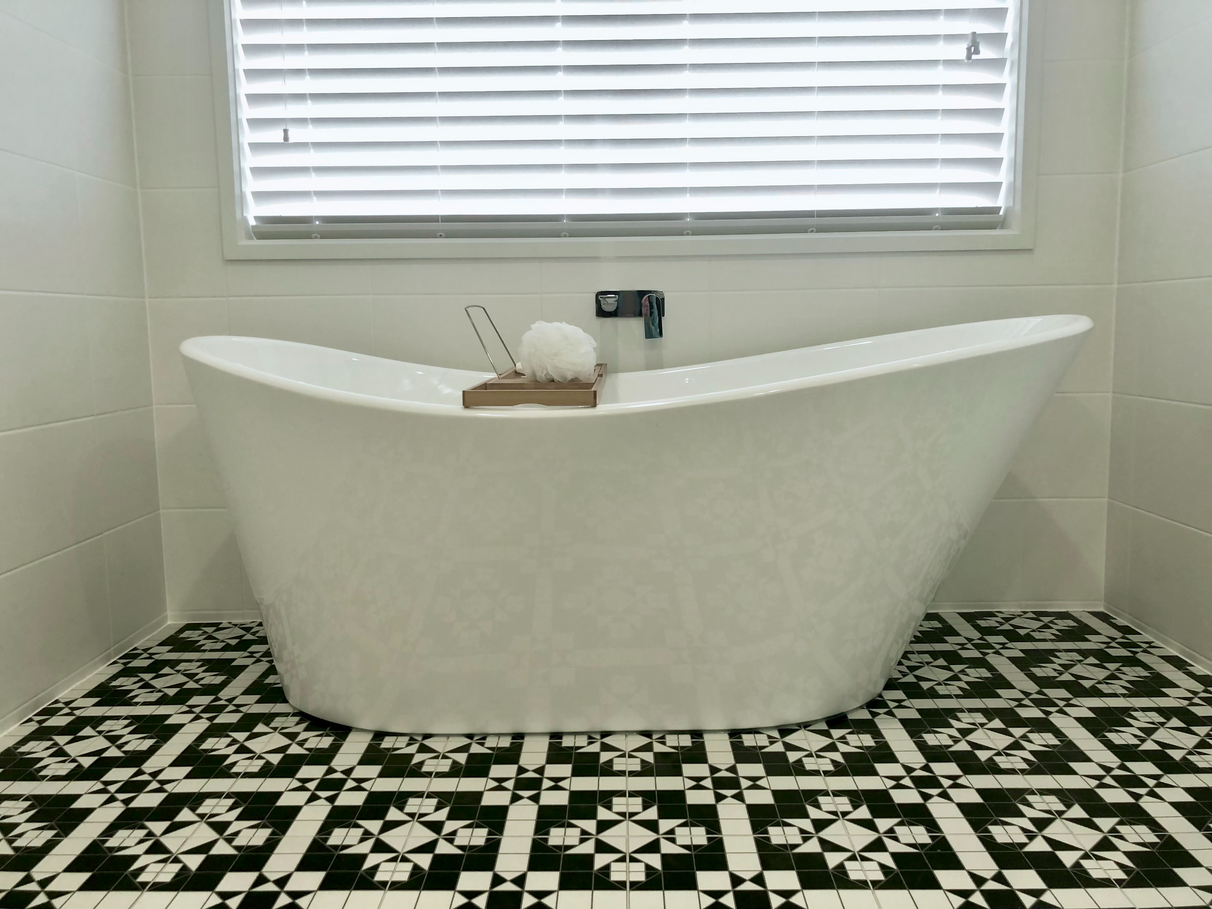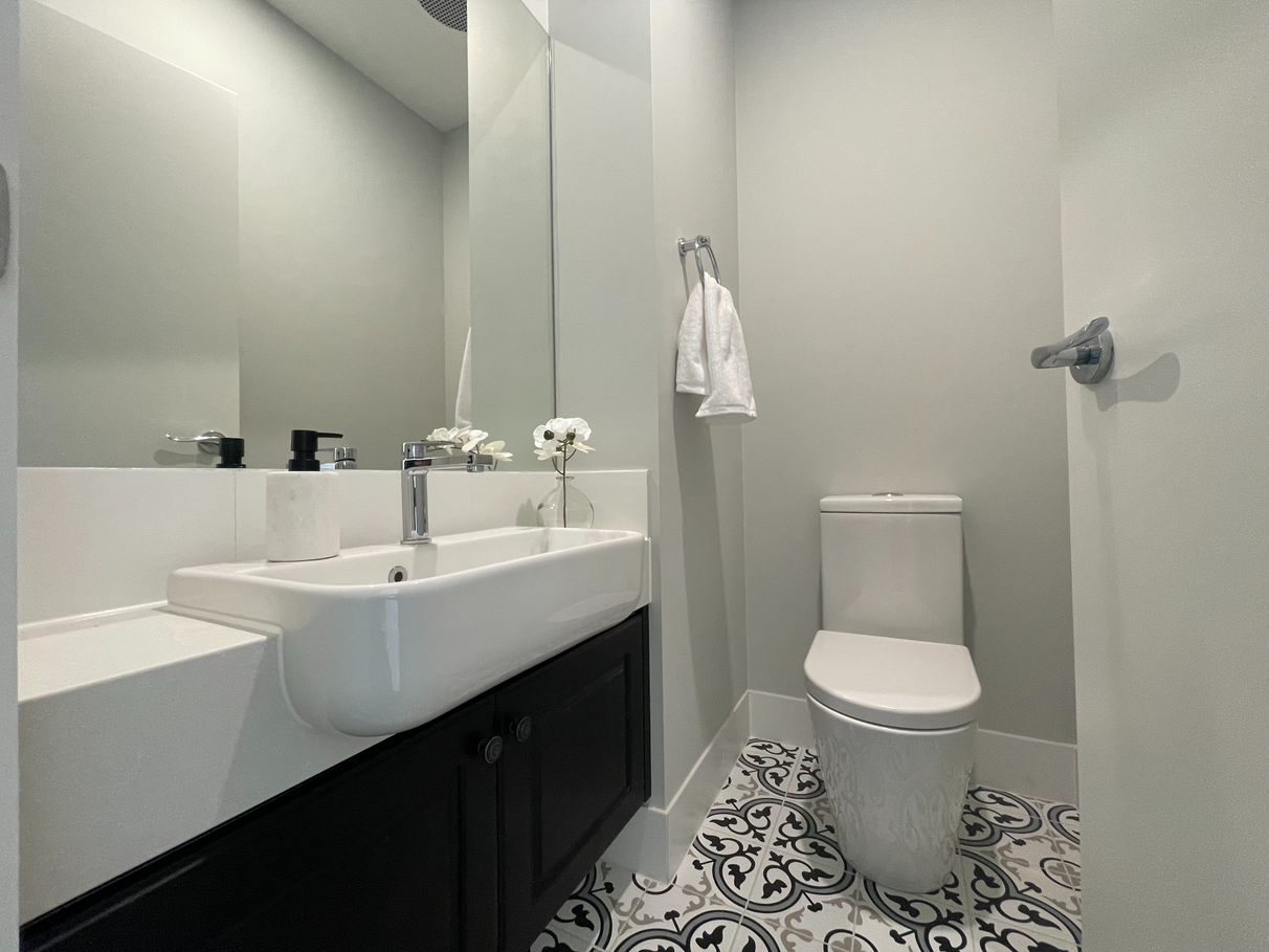 • Main upstairs bathroom with floor to ceiling designer Hamptons tiling