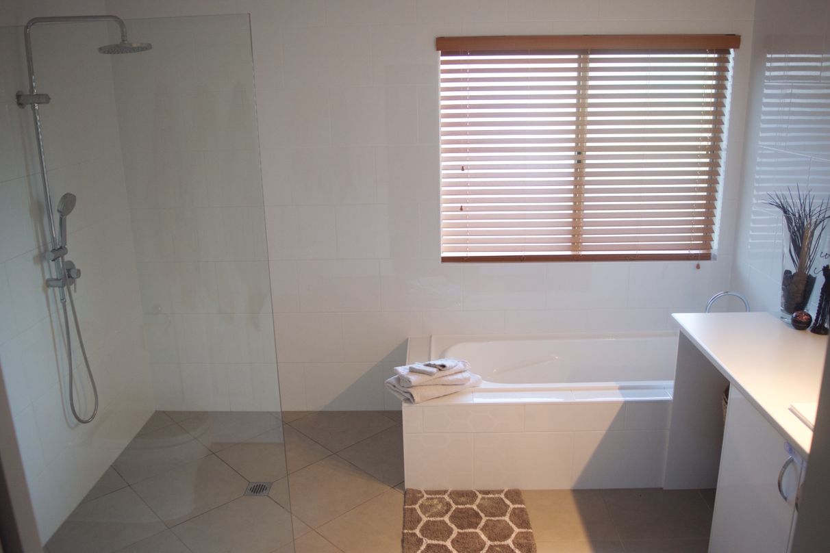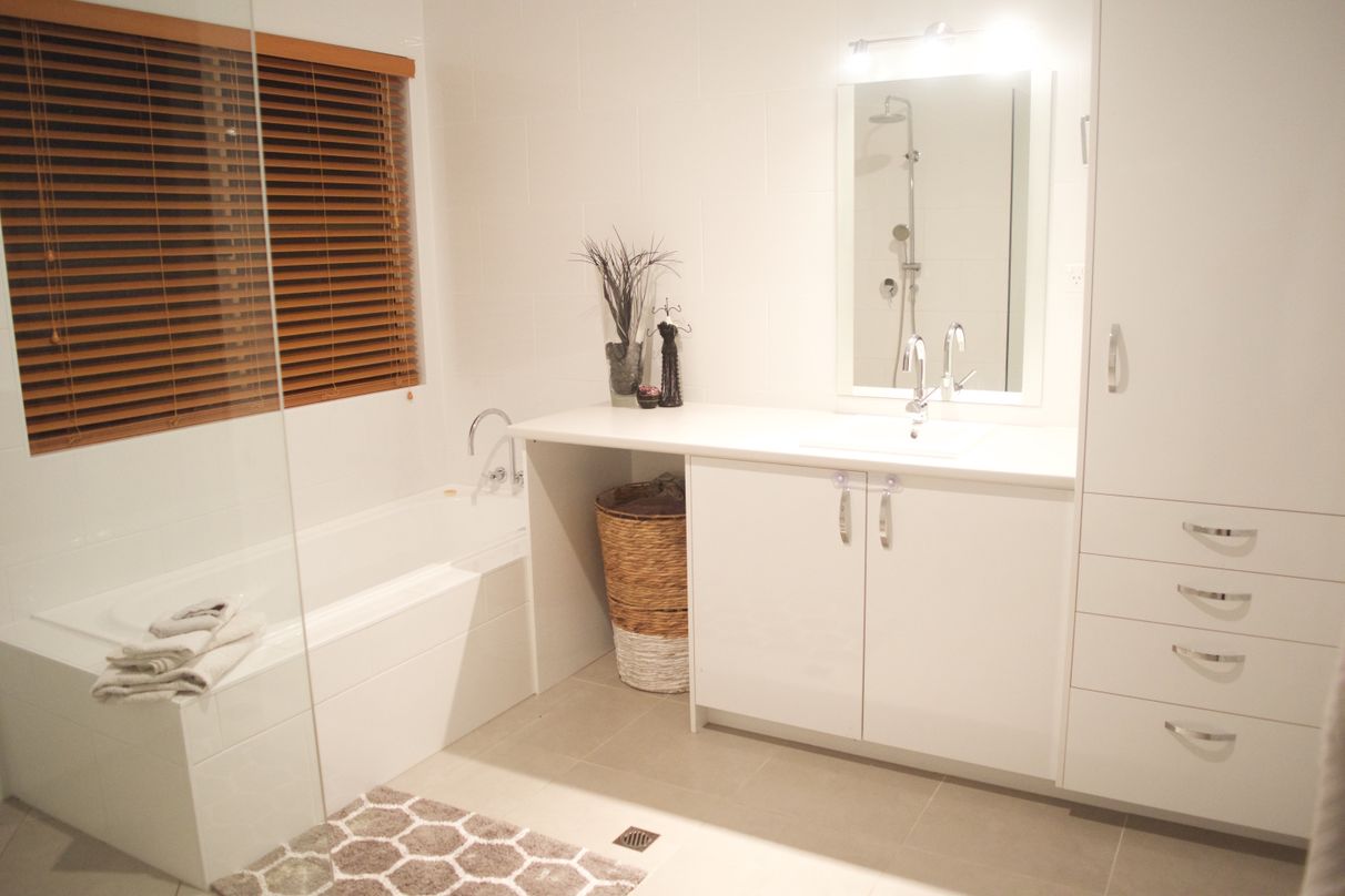 * Large bathroom with walk-in shower, bath, toilet and ample storage.
