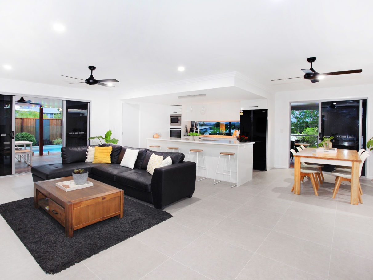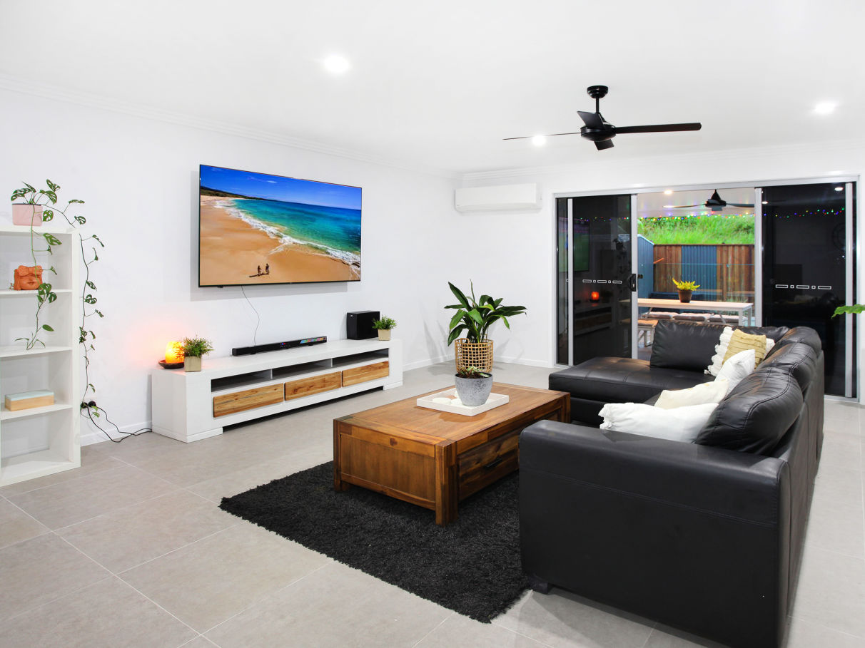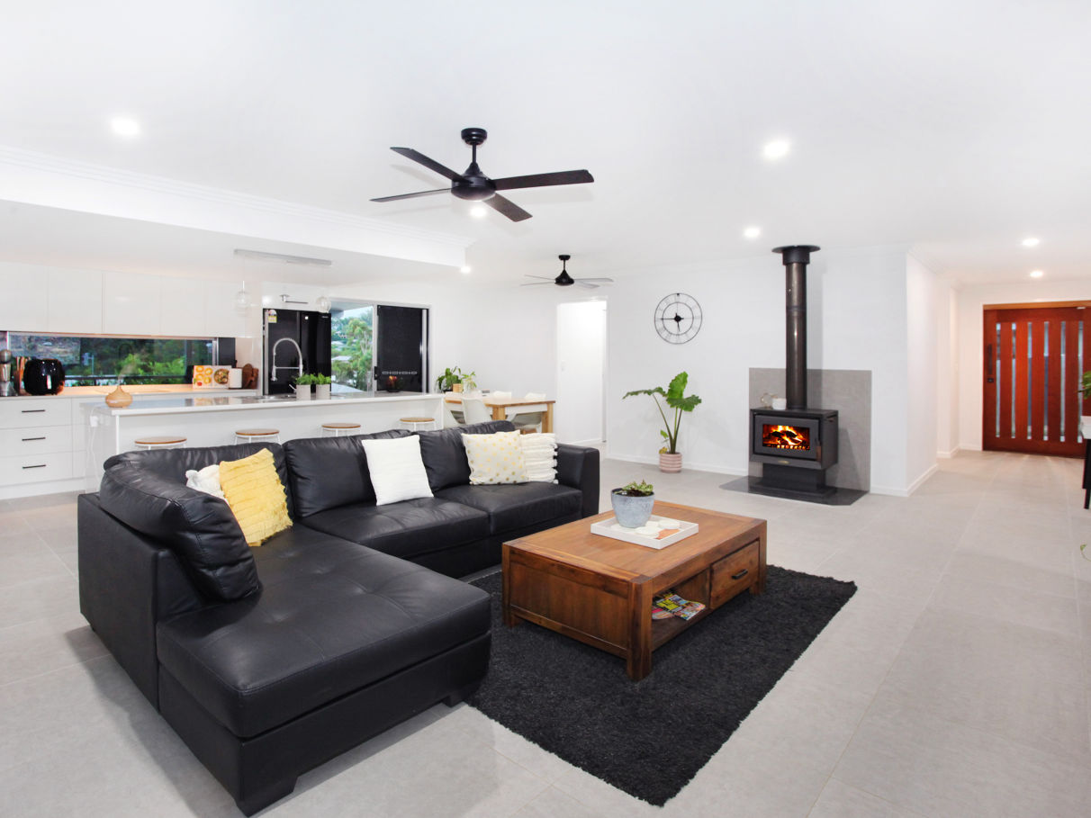 - Spacious tiled open plan living, with fire place and air conditioning