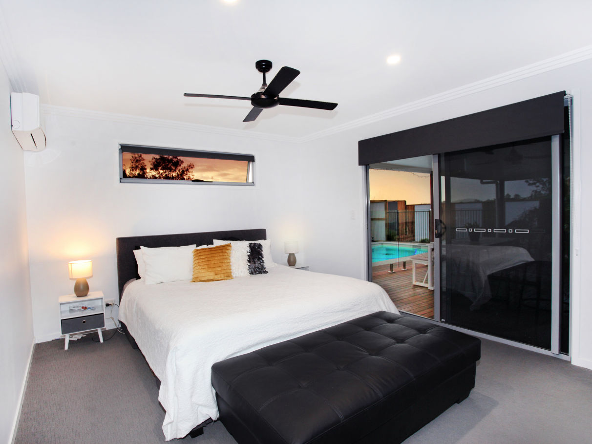 - Master bedroom with views of the pool, with walk-in robe and large ensuite