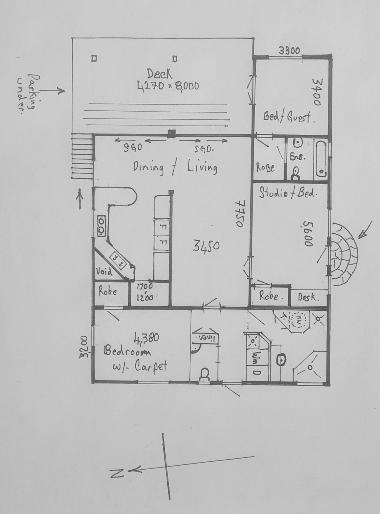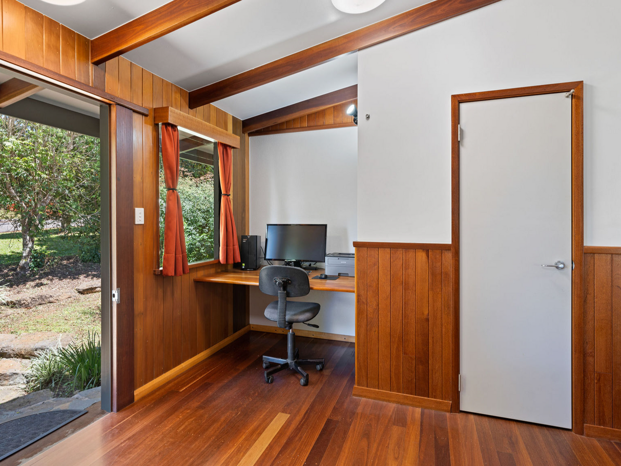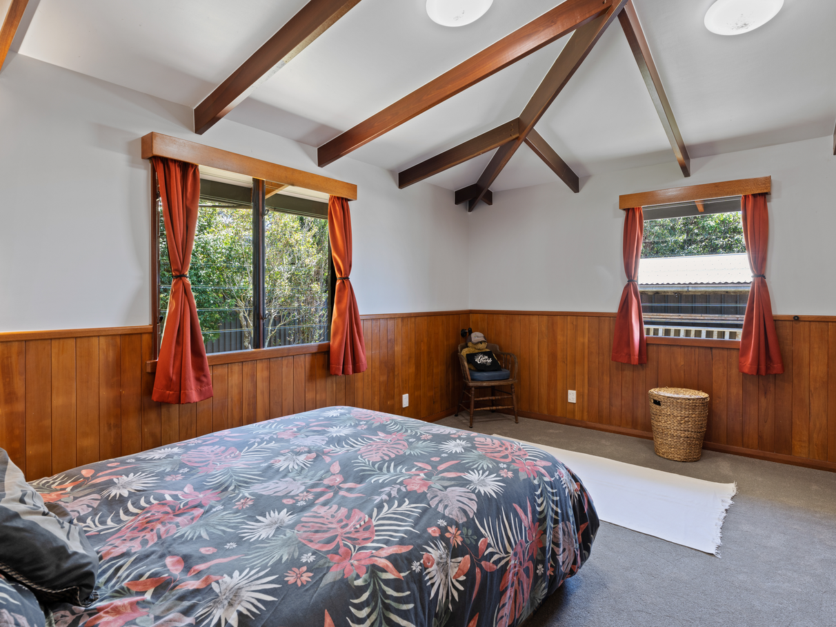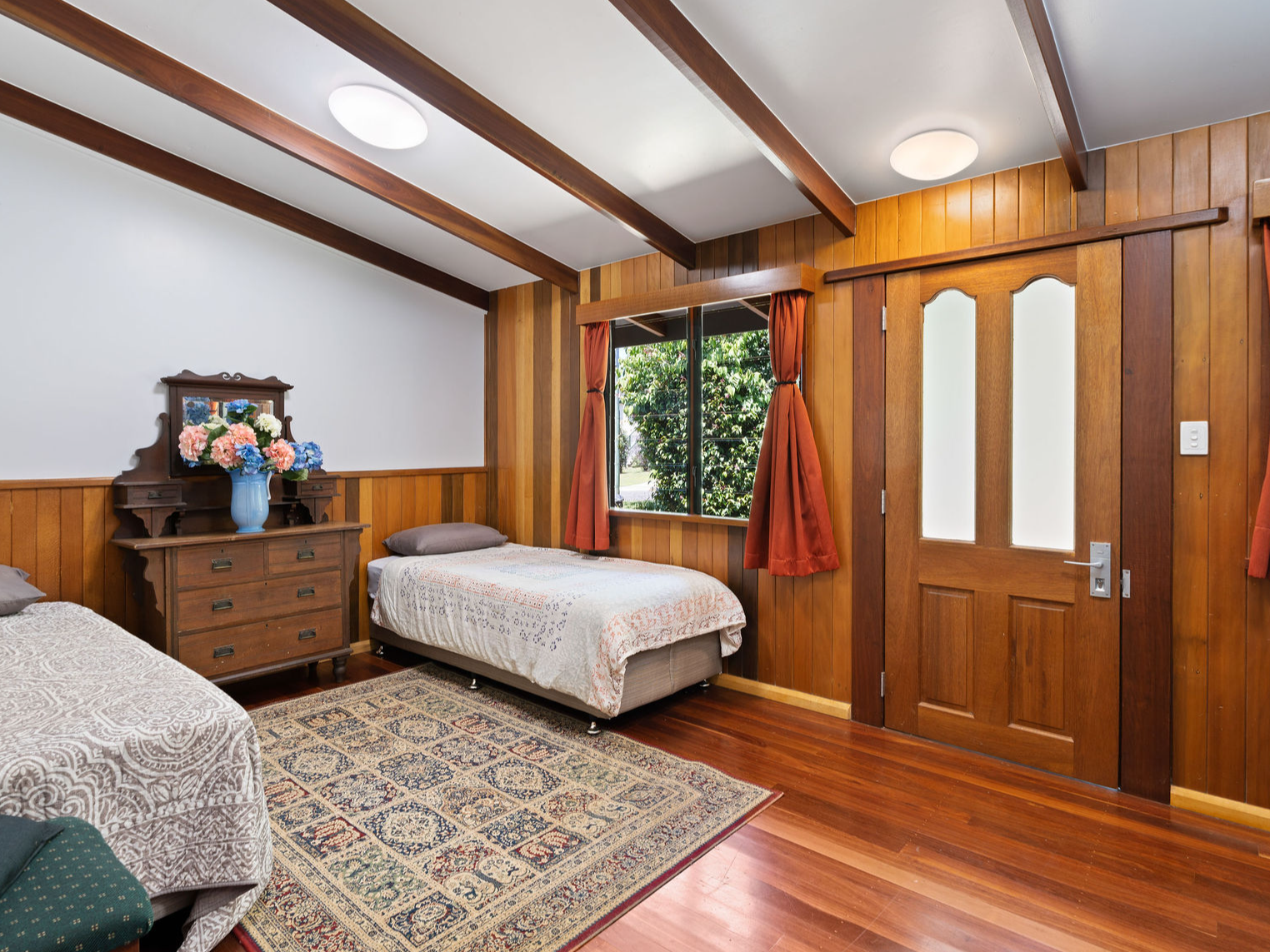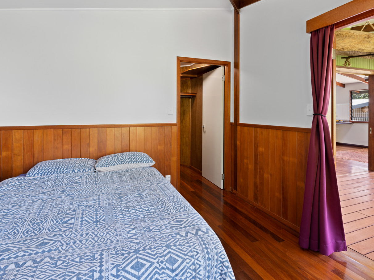 At the southern end of veranda, red cedar French doors leads to a private bedroom with a walk-through robe and ensuite with a bathtub. Currently used as a guestroom.