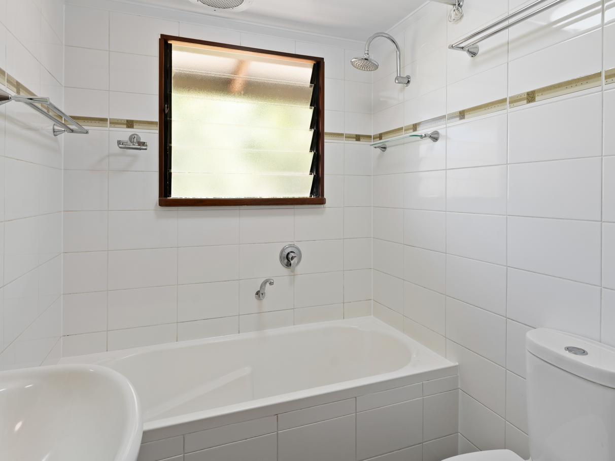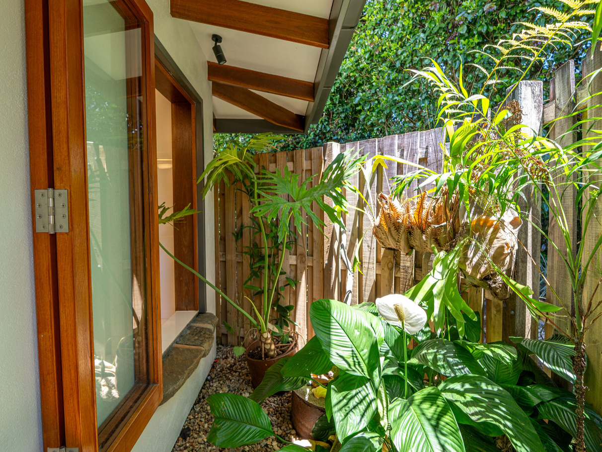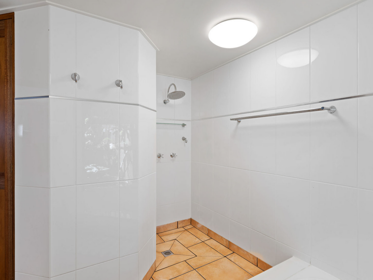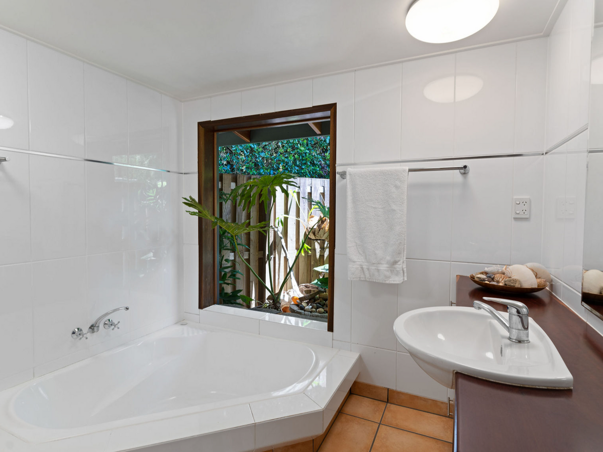 The large main bathroom includes a corner bath with a large feature window that offers views of your private, display courtyard. There is also an easy-access shower, linen cupboard and elegant vanity with Cooktown ironwood tops mounted on plinth. The home also features a tiled wet area with separate W/C with basin and laundry designed to take commercial washing machine and dryer.