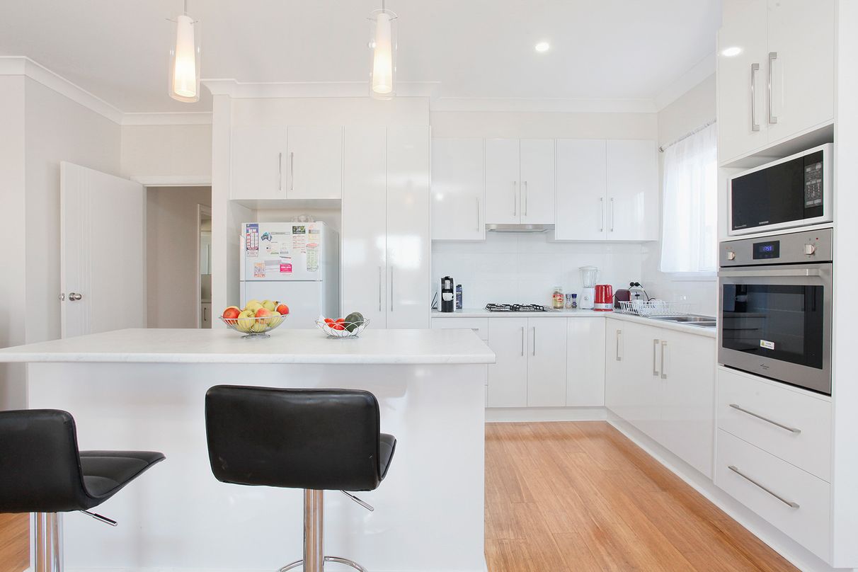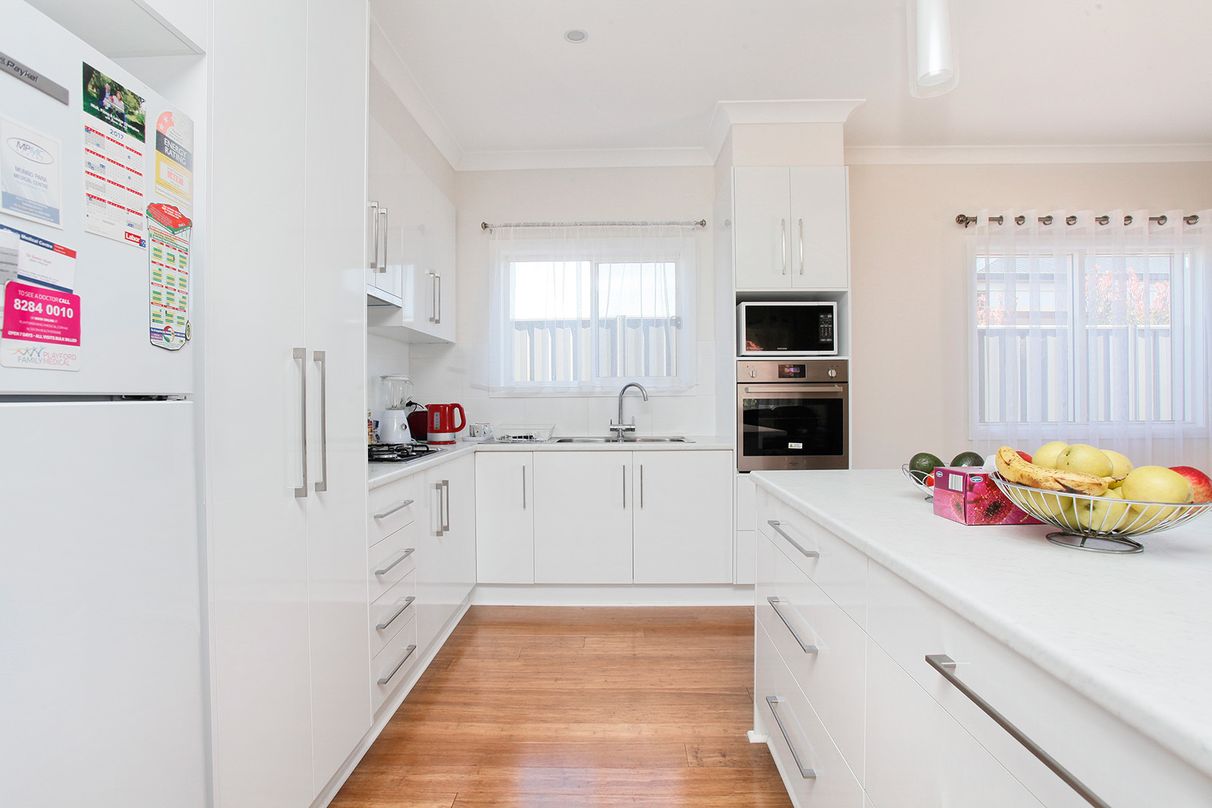 Generous open plan living and dining zones adjoined by the modern, well appointed kitchen in crisp white hues, with stainless steel electric wall oven, gas cooktop, range hood and an abundance of storage.