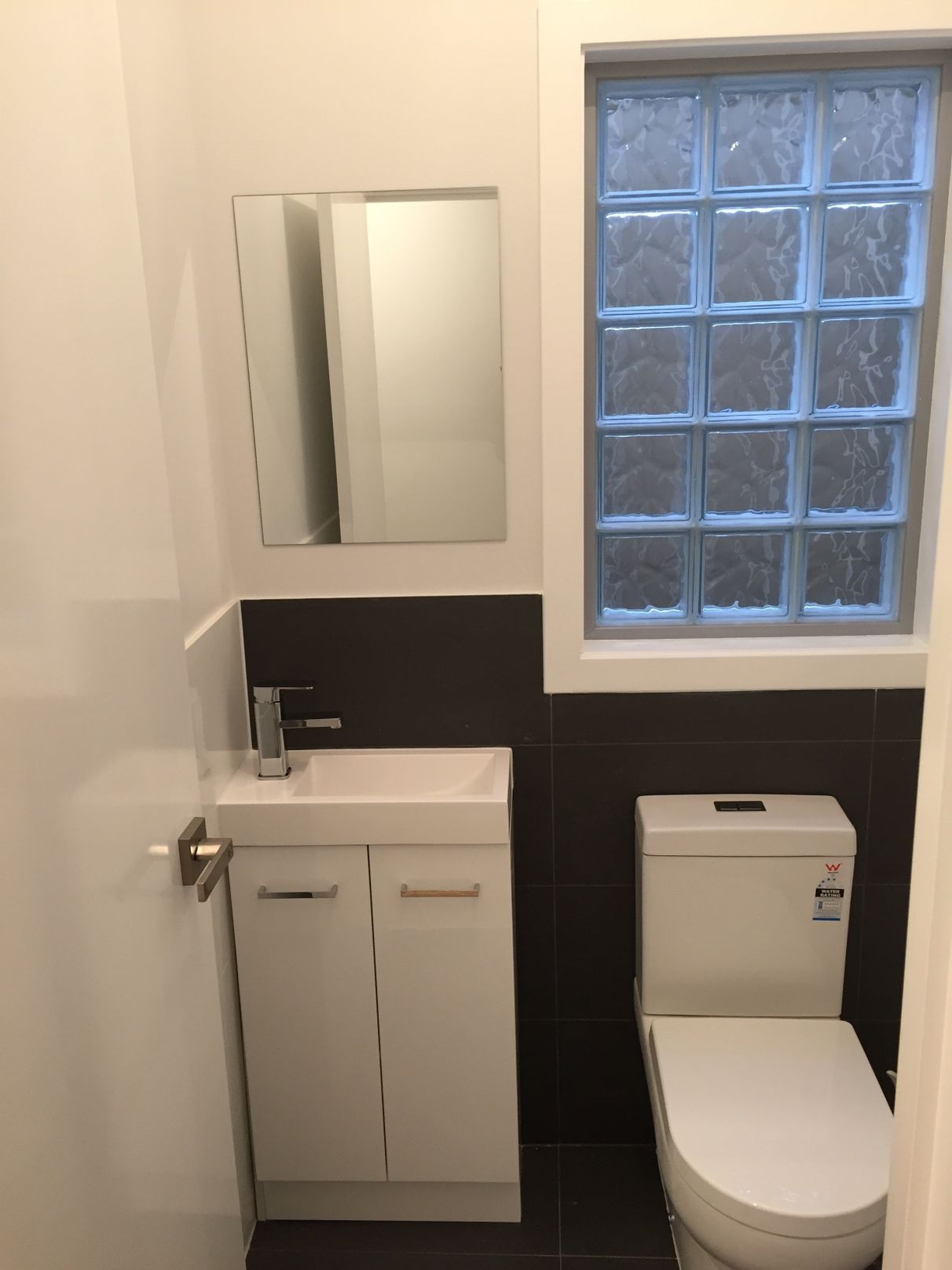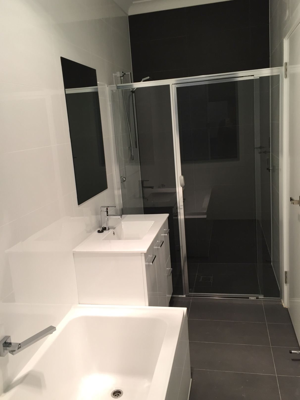 Floating floor and doenlights lead us past a sparking bathroom and toilet, Single garage with automatic roller door.