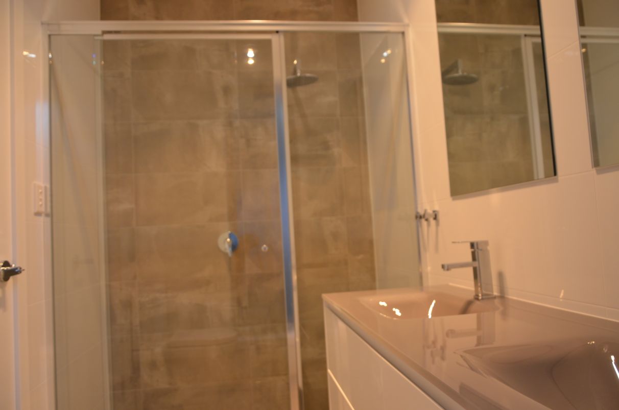 downlights lead us past a sparking bathroom and toilet, Reverse Cycle Air Conditioning, Single garage with automatic roller door.