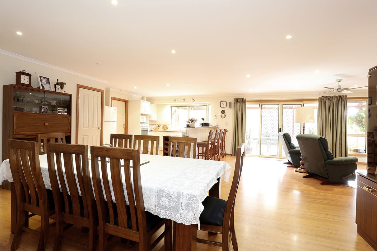 Open plan family, dining, kitchen area with floating timber flooring.