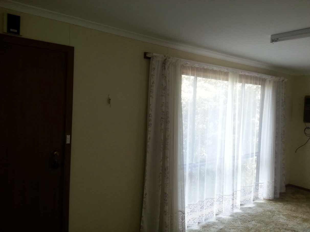 Lounge is carpeted, has air conditioning and roller shutters on the window.