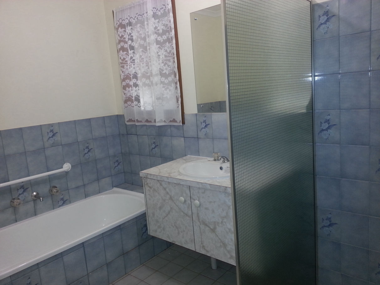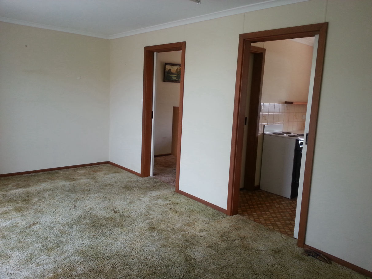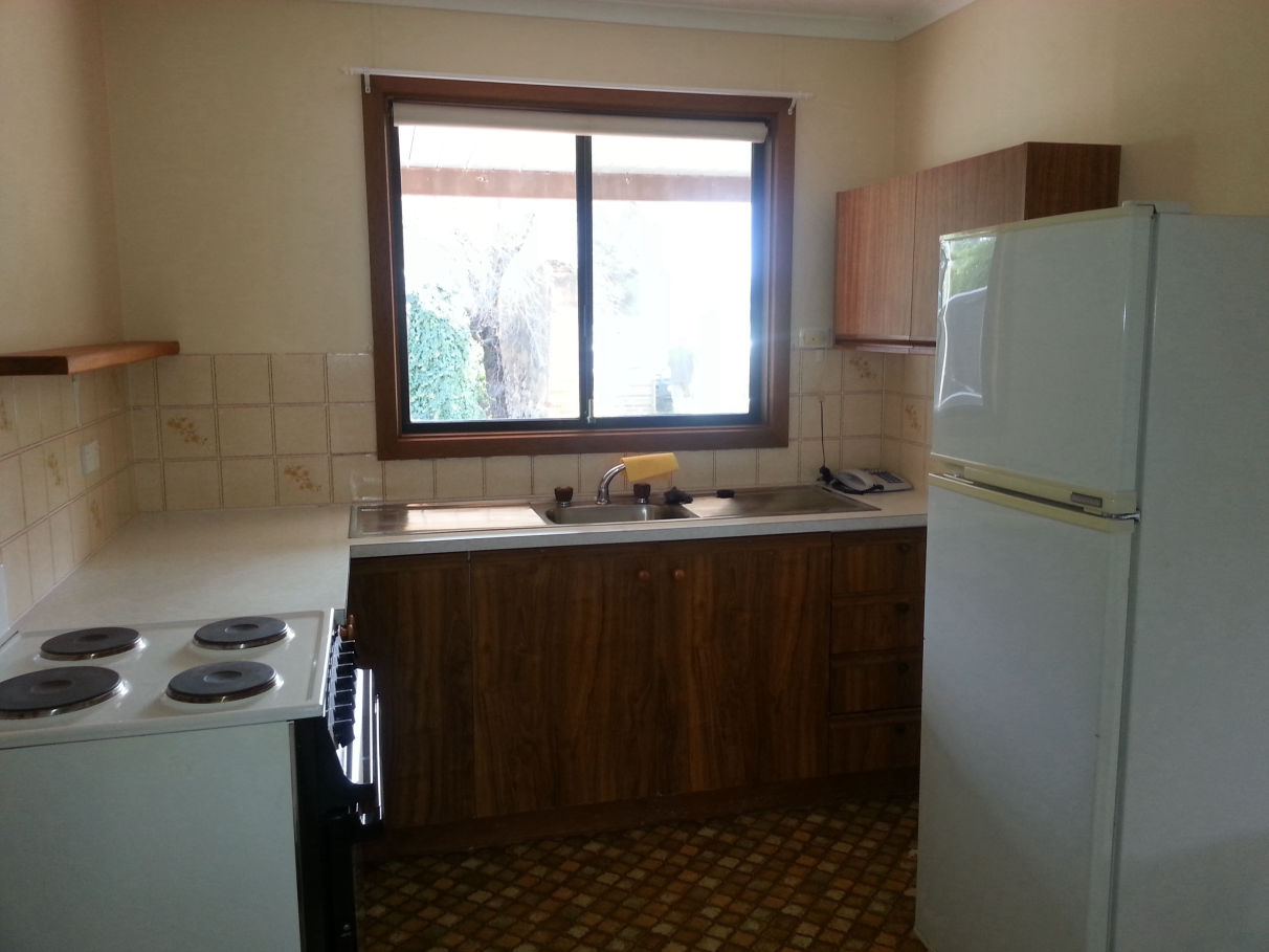 Kitchen has stove, a medium sized fridge and inbuilt cupboards in good condition.