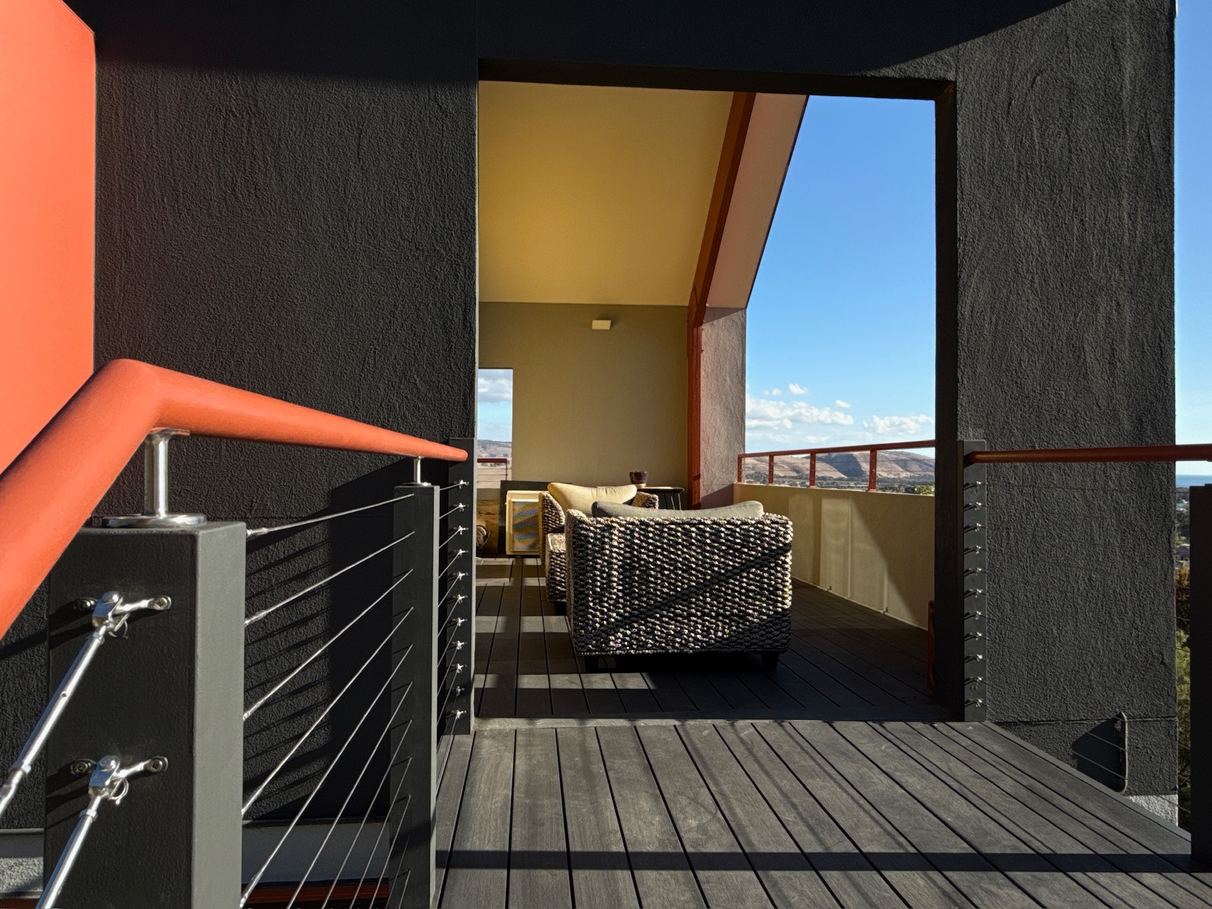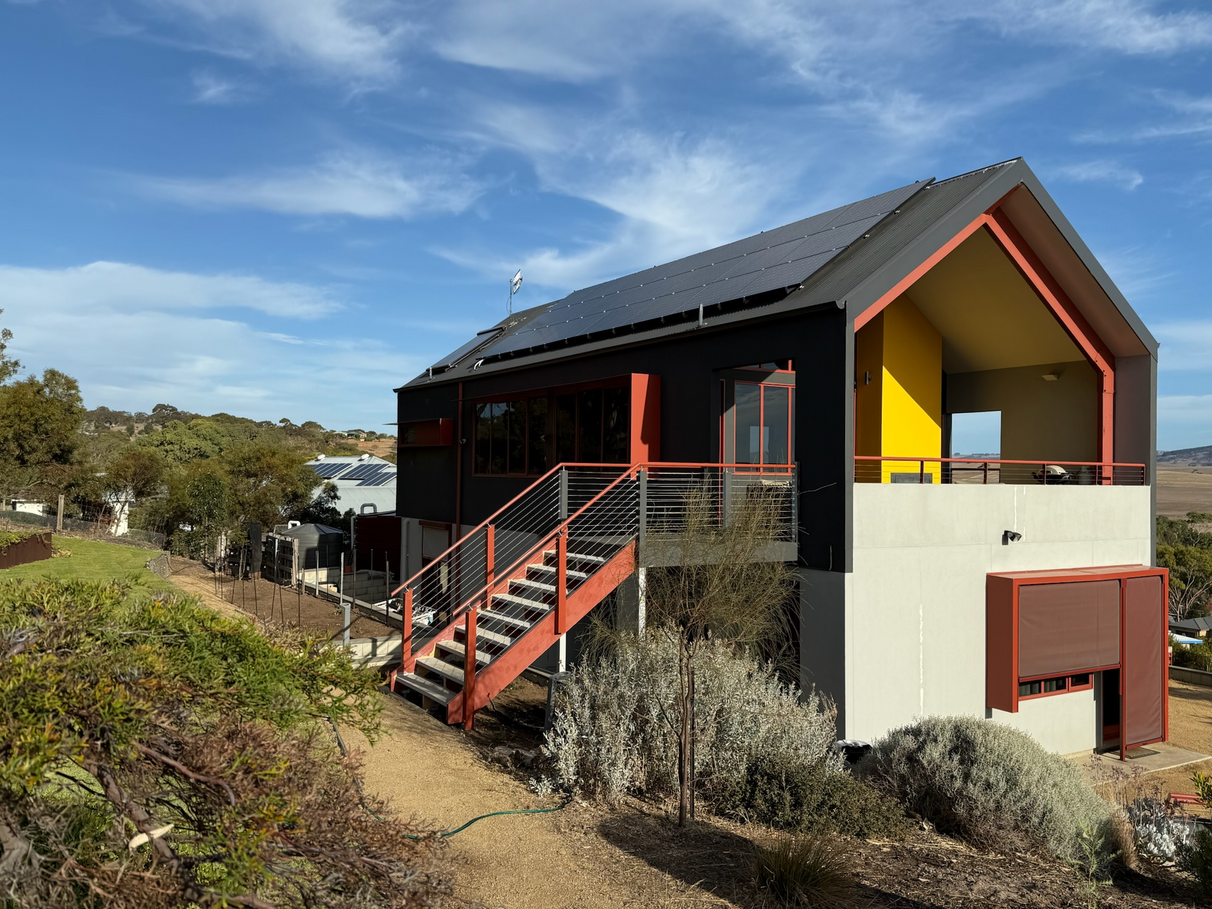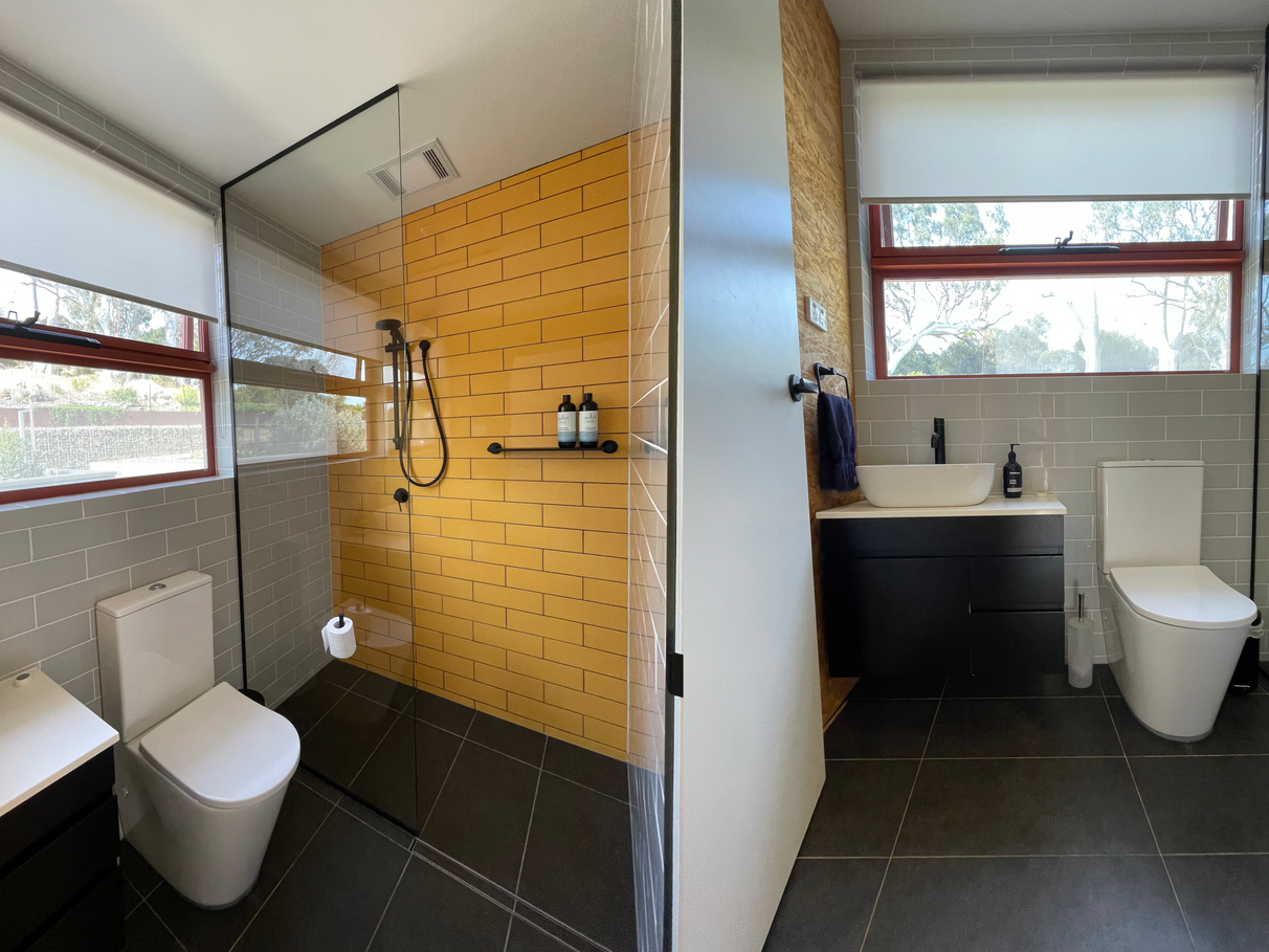 1. Main house has three bedrooms with built-in robes, an open plan living area with 270 degree views across the landscape and down to the sea. The large deck with external fireplace is accessible from the Dining area. A hidden storage loft is featured above the master bedroom.