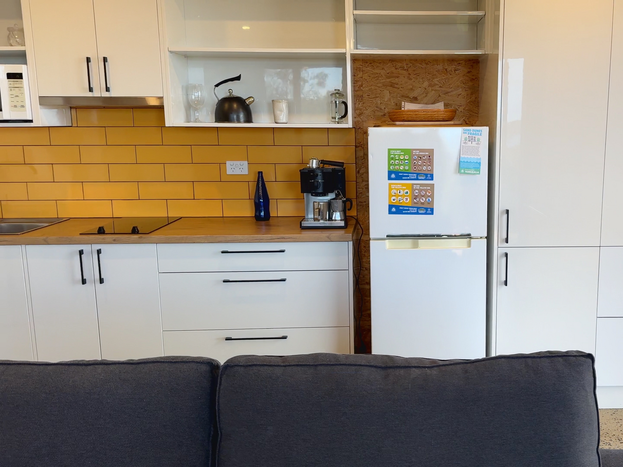 Secondary Kitchenette in studio downstairs with dual burner ceramic cooktop, rangehood and sink.
